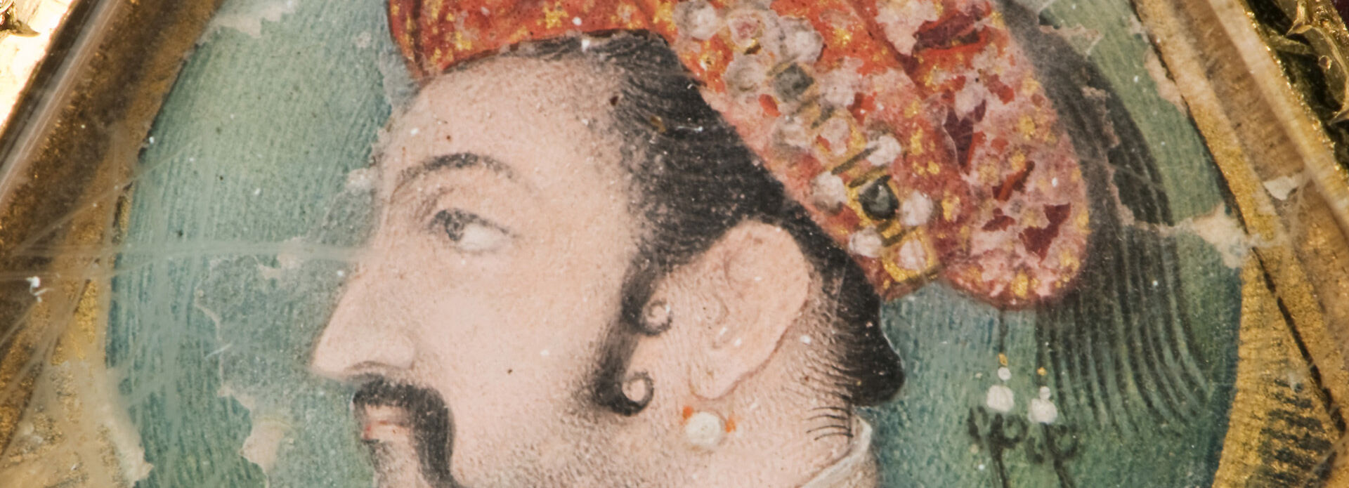 Om 4 dagar kan du se den indiska stormogulen, Jahangir, 1569-1627 skildrad av en okänd konstnär i början av 1600-talet. Akvarell på pergament. Hexagonal ram, guldkapsel med röda emaljerade sidor och emaljerat blomstycke på baksidan.