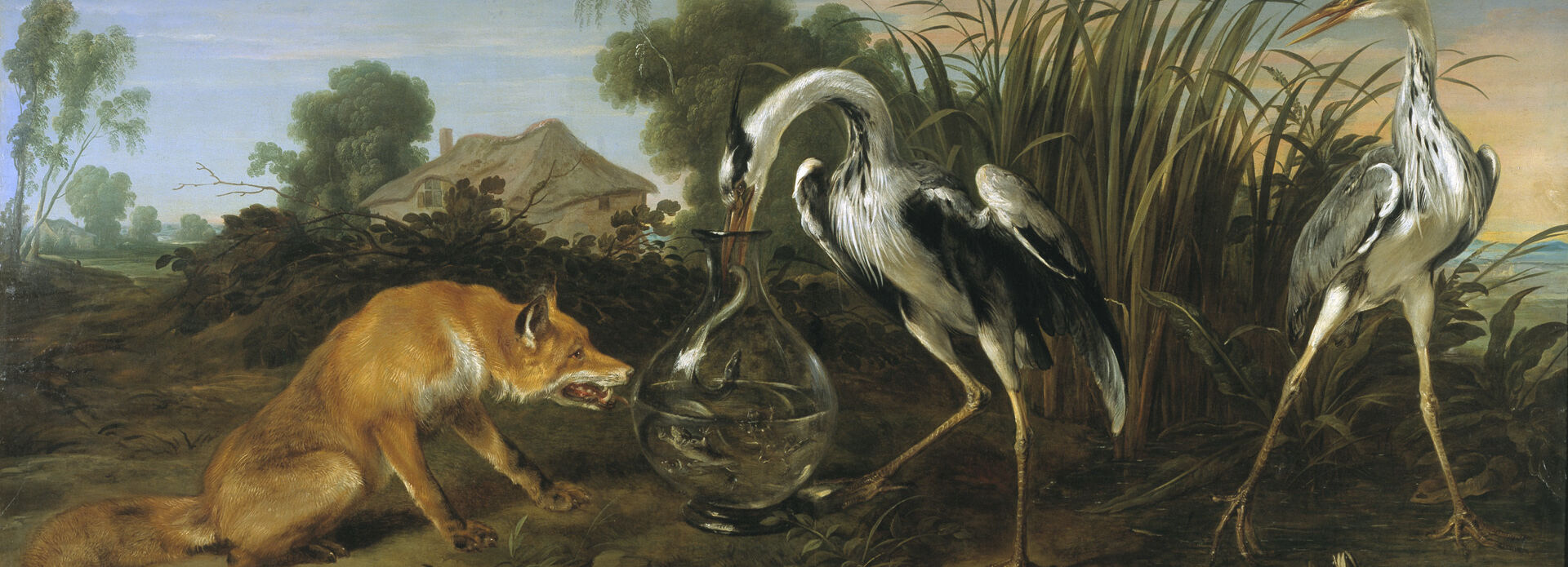 Enligt traditionen skrevs många fabler av den grekiske skalden Aisopos, som ska ha levt på 500-talet f. Kr. Genom historien har dessa berättelser inspirerat många konstnärer. I den här målningen från 1630-talet har den flamländske konstnären Frans Snyders (1579-1657) valt fabeln om räven som är på besök hos hägern.