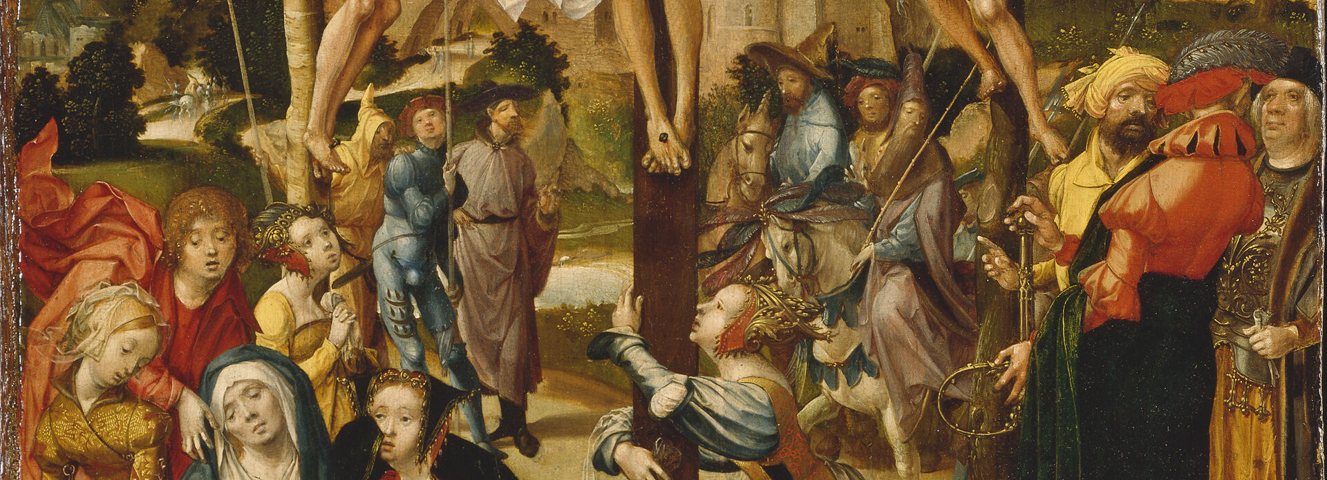 Denna centrala händelse i Bibelns berättelse om Jesus framställs på ett färgstarkt sätt i det här verket. Det målades omkring år 1520 i ateljén som tillhörde den nederländske konstnären Cornelis Engebrechtsz. Klädd i rött står Johannes bakom jungfru Maria och stöder henne. Hon har kollapsat av smärta. Den steniga marken, molnen på himlen och det ändlösa fantasilandskapet återges med oljemåleriets djupverkan och lyster. Målningen tillhörde redan år 1547 de kungliga samlingarna på Gripsholms slott.