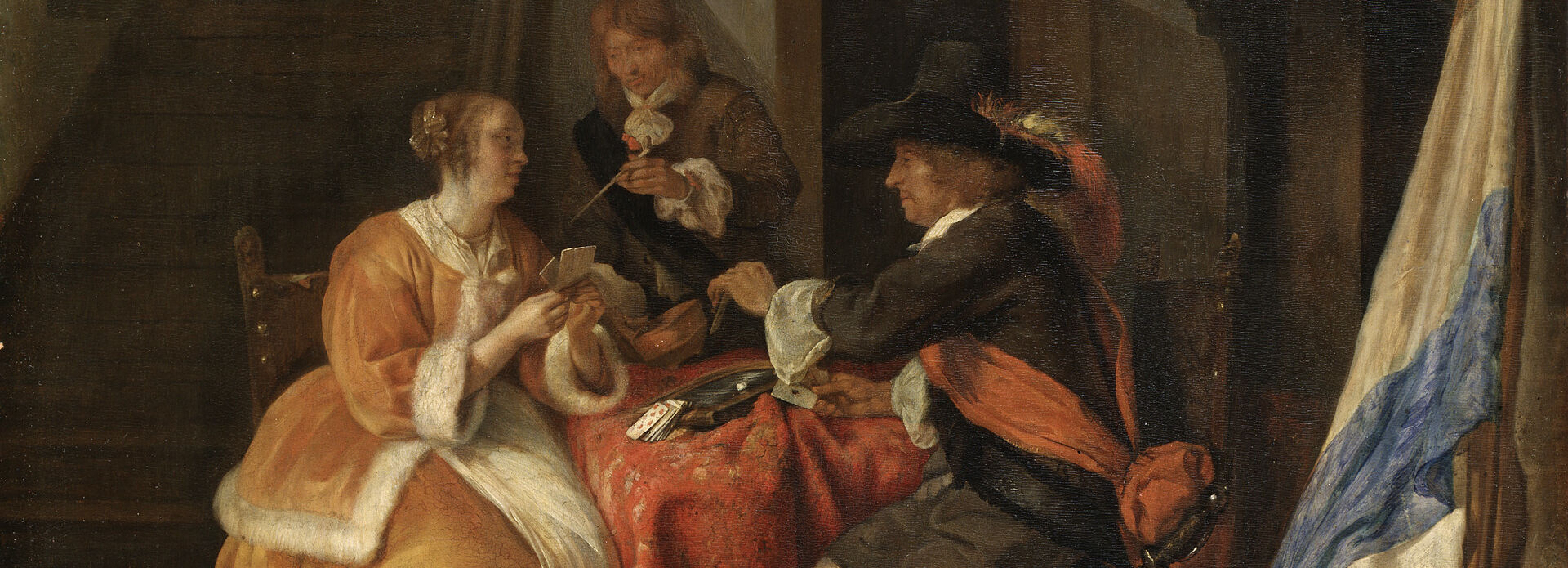 I den här målningen av den holländske konstnären Gabriel Metsu ser vi en ung fashionabel kvinna som har på sig en matinée. Hon spelar kort med en officer i en elegant interiör. Scener där soldater umgås med kurtisaner har en lång tradition inom nederländsk konst och denna målning kan tolkas som en del av den traditionen.