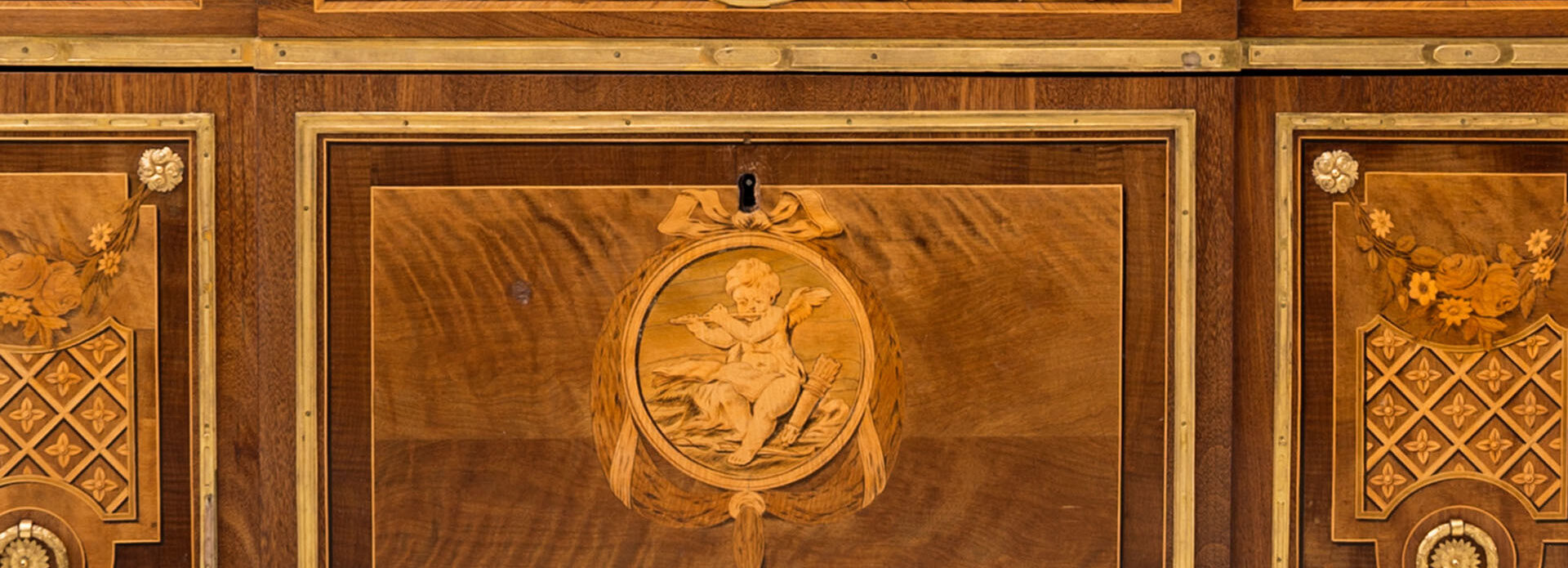 Under den här tiden befann sig Georg Haupt på gesällvandring i Paris, och han tog starkt intryck av det han såg. Hans förebild för den byrå vi ser här var en byråmodell som de franska bröderna Jean-Francois och Simon Oeben skapat redan år 1759. Det tydligaste kännetecknet på den kvardröjande rokokon är de lätt svängda benen. Byrån står bokstavligen kvar med benen i rokokon. De nyklassicistiska dragen syns tydligt bl.a i de översta bronsbeslagen.