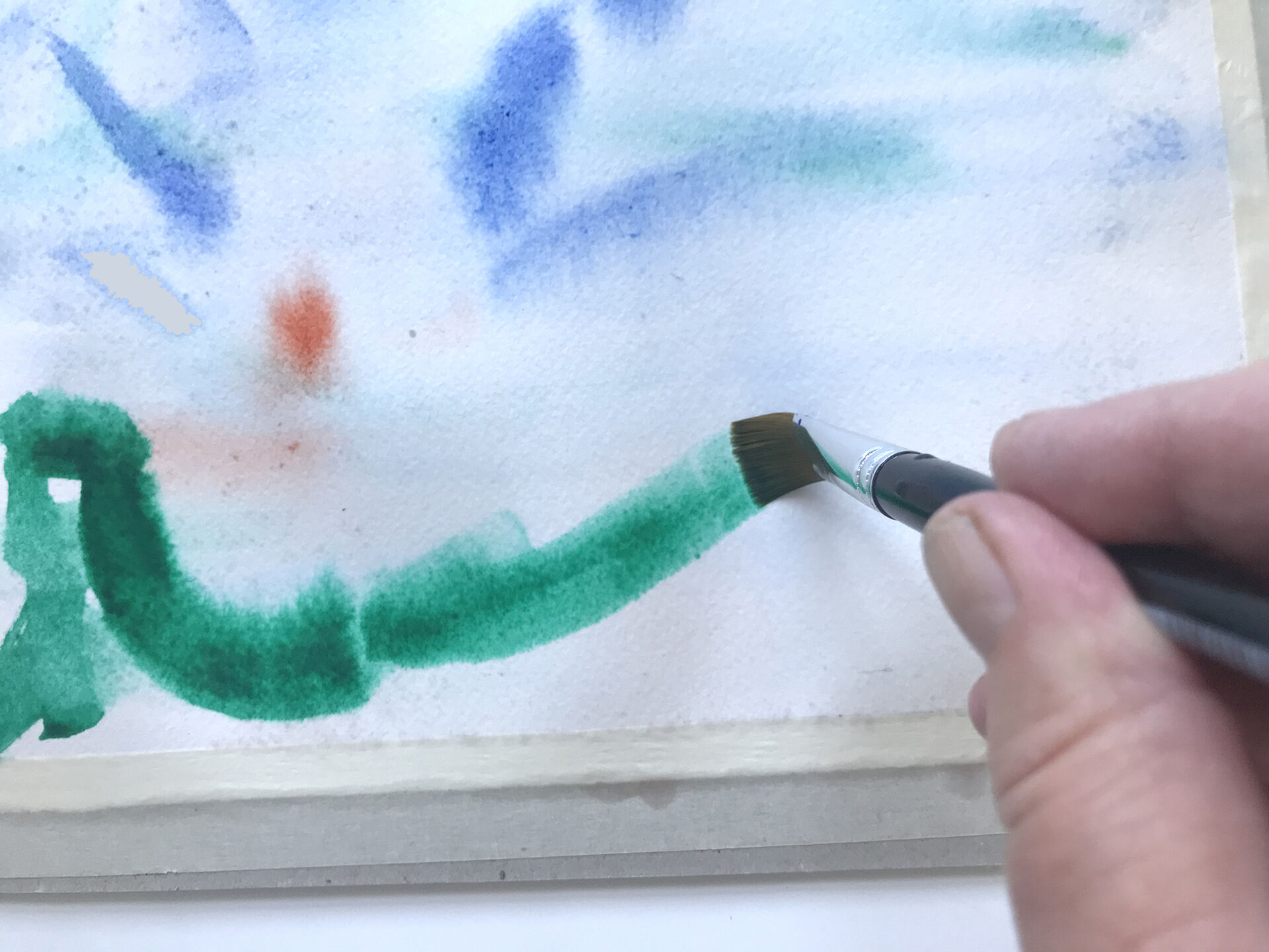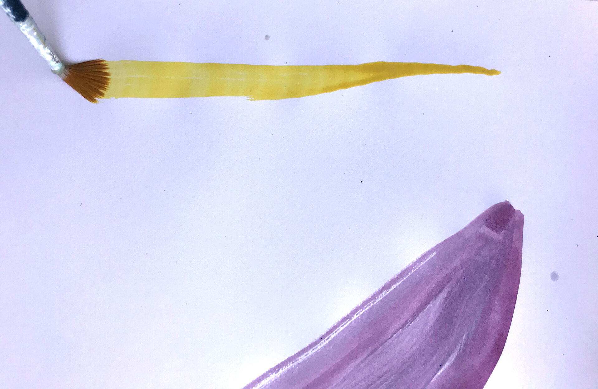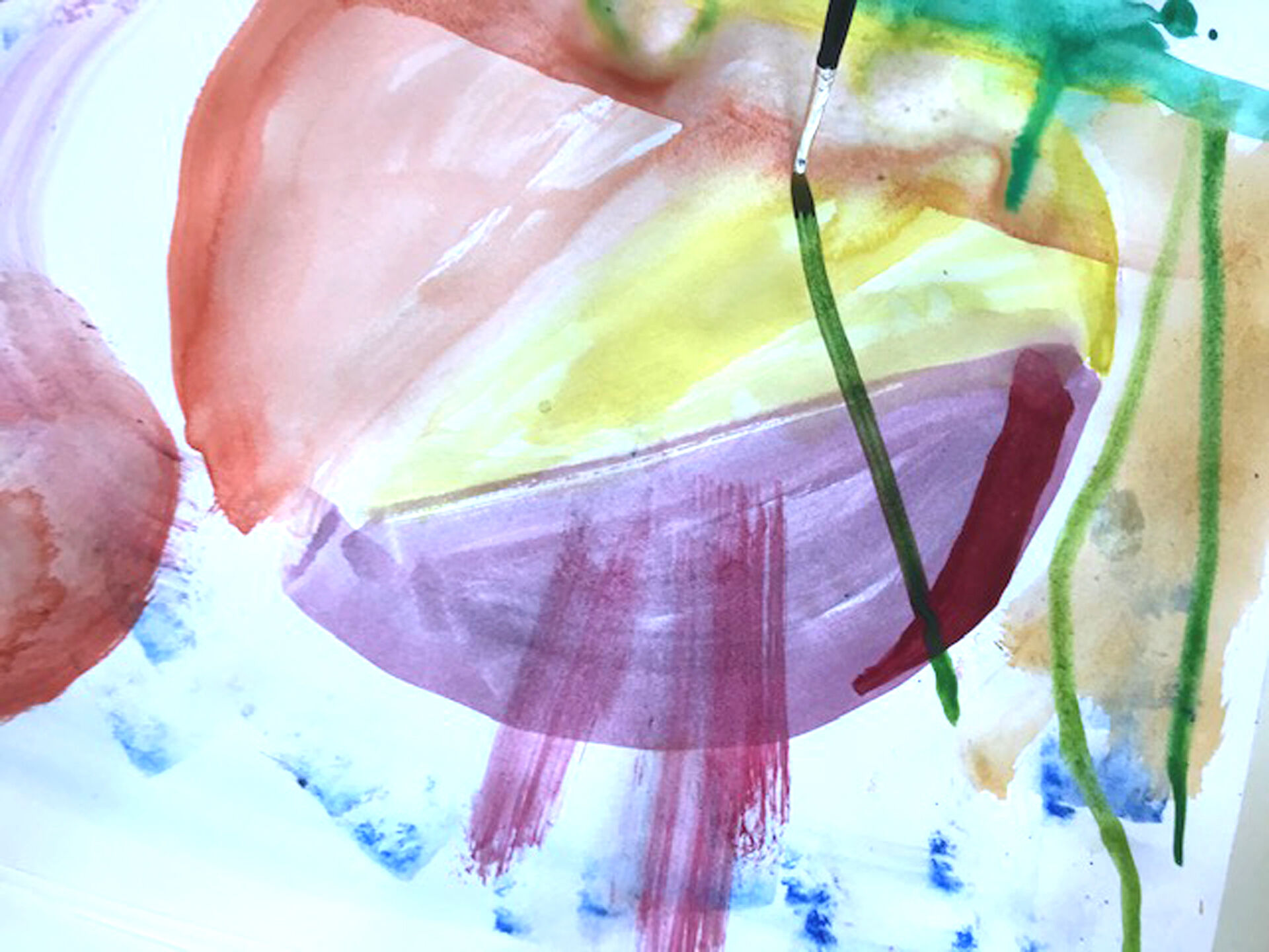 Har du mycket rinnig färg i penseln kan du experimentera med att dra streck och luta pappret så all färg rinner i ilar åt ett och samma håll. Finns där två streck med olika färger kan du låta dem rinna isär och ihop genom att luta pappret åt olika håll.