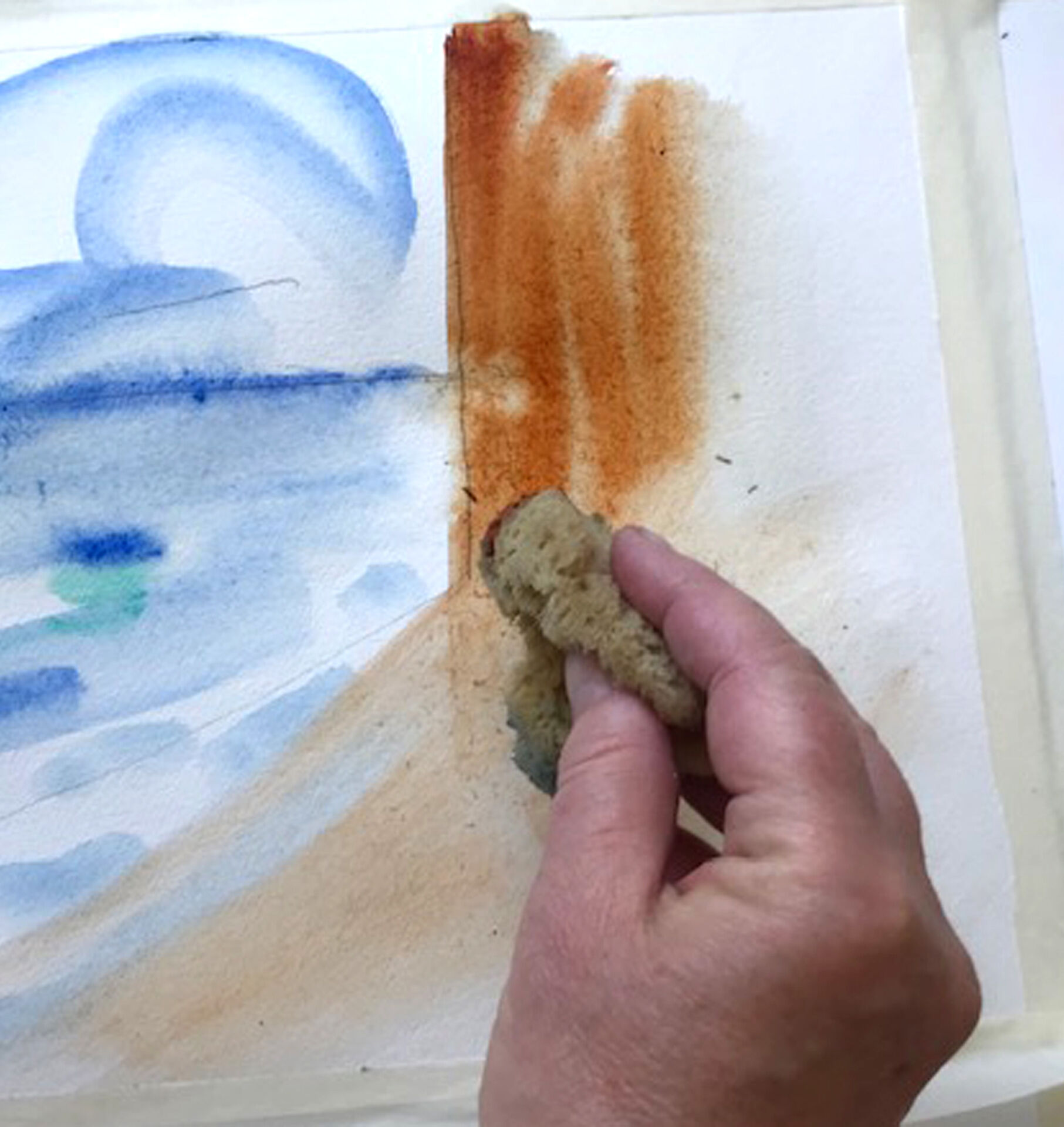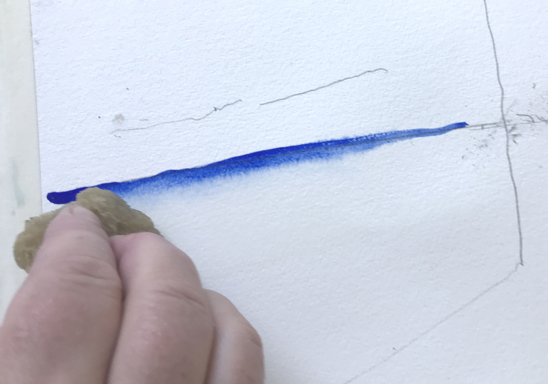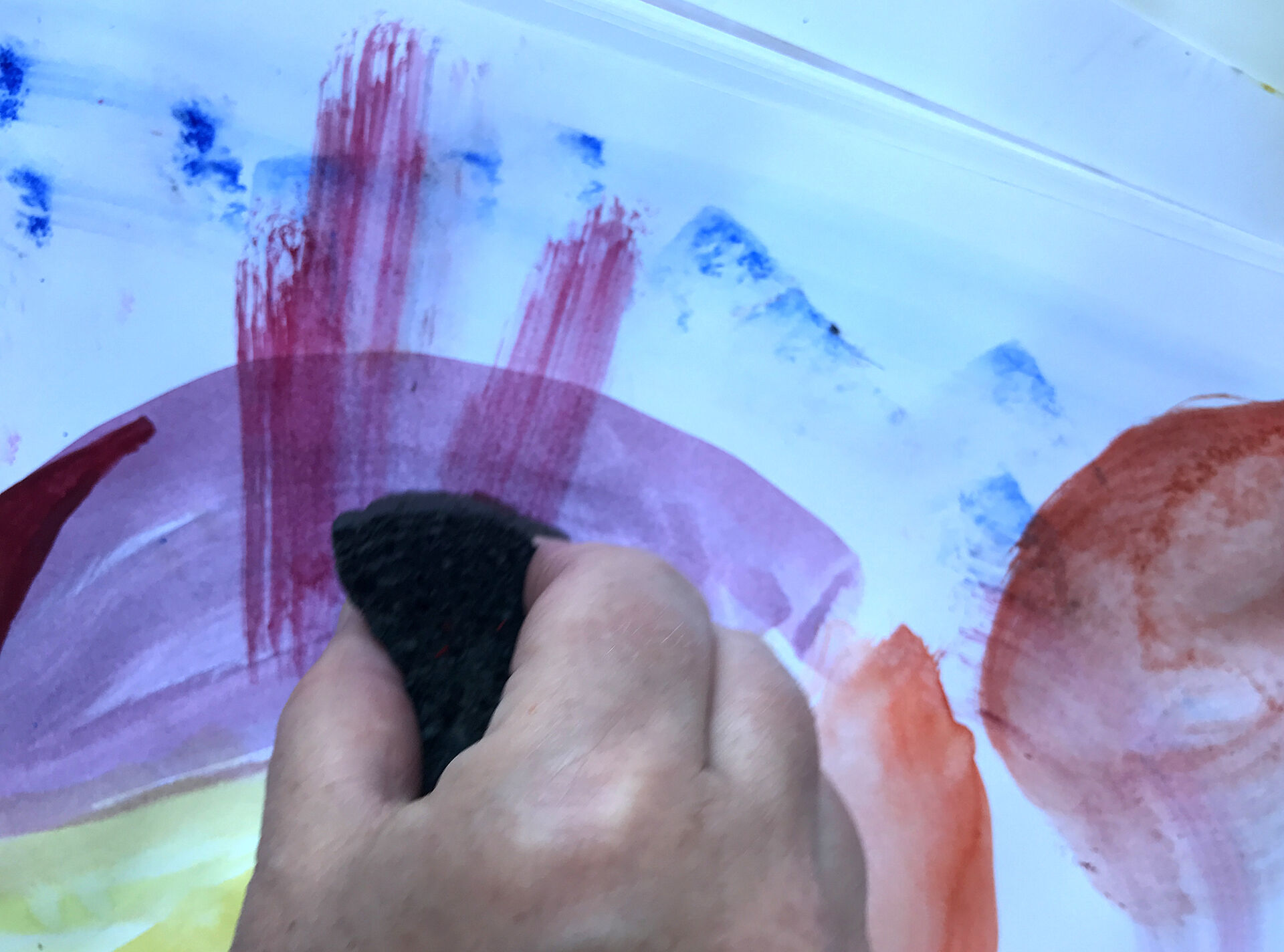 Pröva att doppa din svamp i vattnet krama ur och mojsa runt på färgkakan. Dra med svampen över pappret, det känns och ser förstås annorlunda ut än det målade penselstrecket.