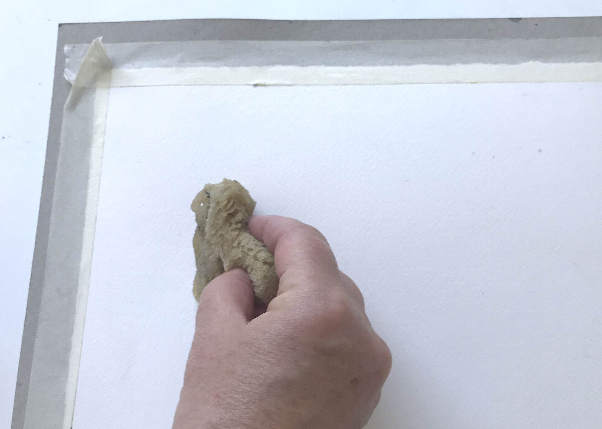 Nu kan du ta din svamp eller trasa, doppa den i vatten och krama lite försiktigt runt den så den släpper litet av vattnet. Sedan är tanken att du ska fukta pappret ordentligt med svampen genom att stryka den över pappret. Du kommer se att pappret bucklar sig lite. Det blir slätt igen när det torkat.