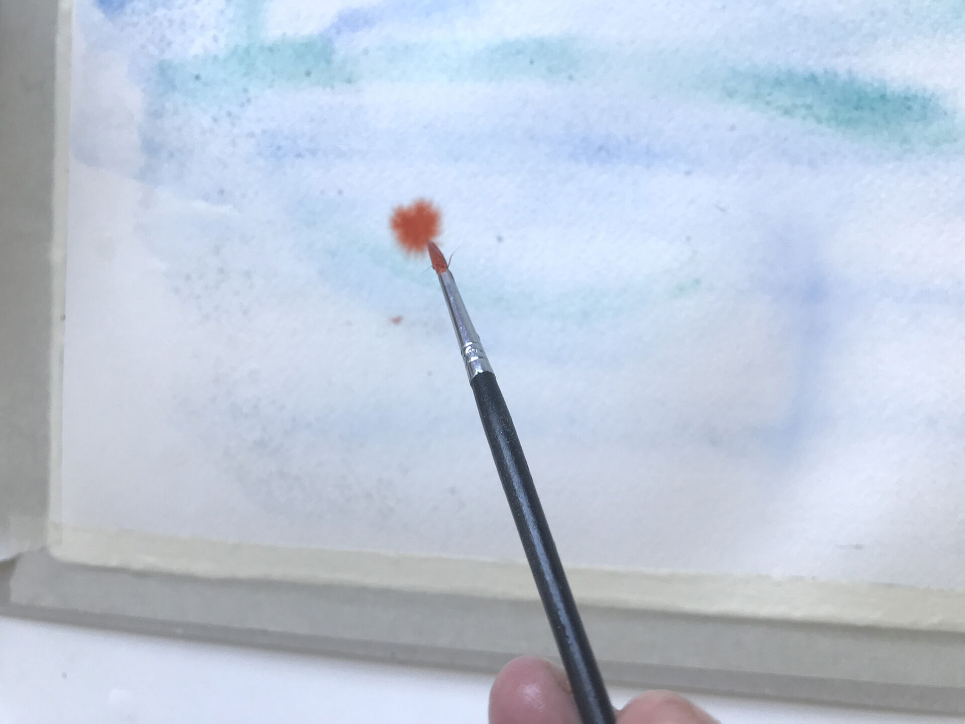 Doppa en av dina penslar i en burk du fyllt med vatten från flaskan. Skaka lite på penseln så den droppar av innan du mojsar runt den på den torra färgkakan. Du behöver inte ta i hårt eftersom färgen lätt löser upp sig av vattnet.