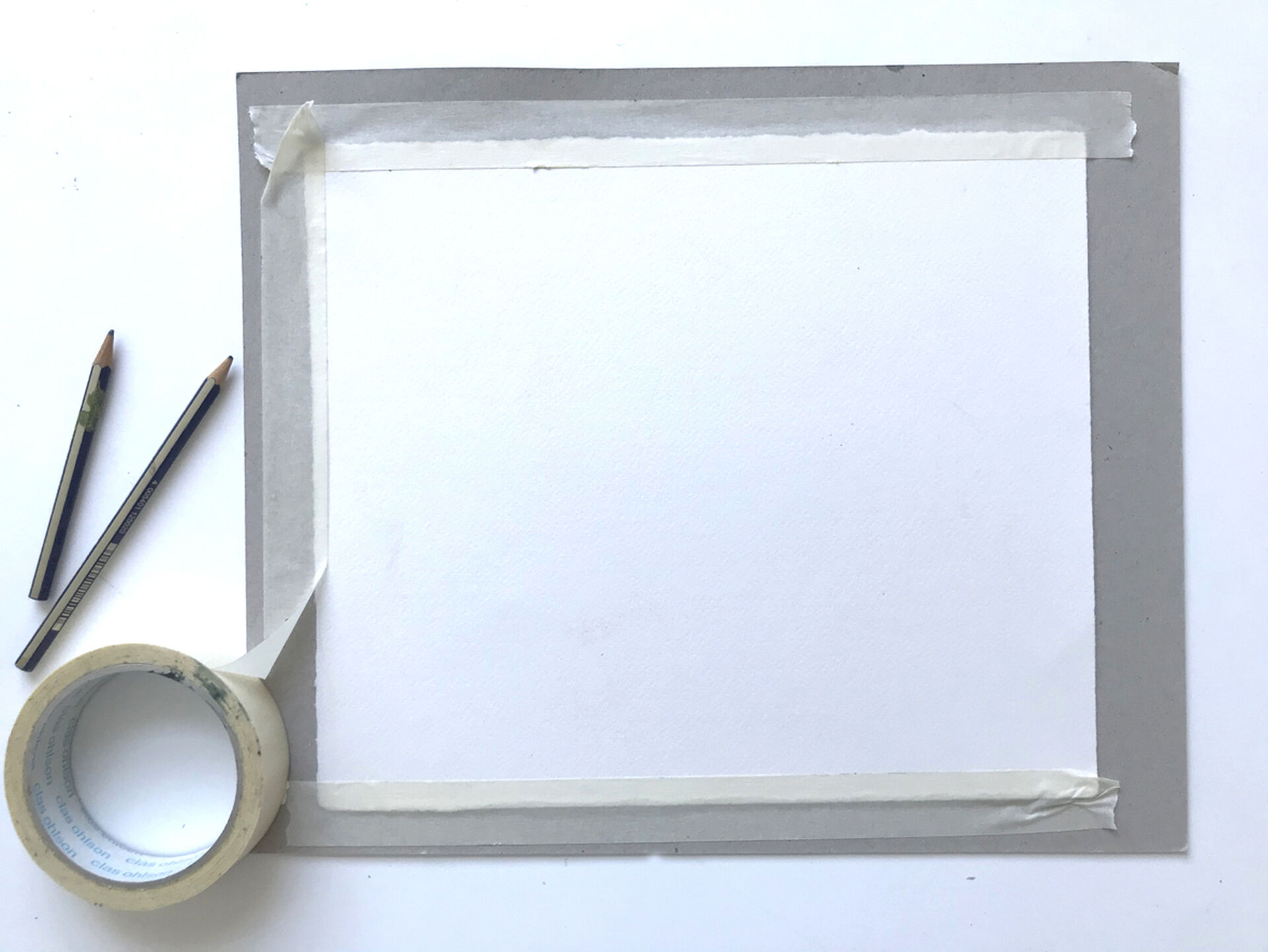 Börja med att tejpa fast pappret på underlaget längs alla sidorna så kommer pappret hålla sig slätt när färgen torkat. Utan tejpning kommer pappret att bubbla sig av vattnet du använder till färgen.