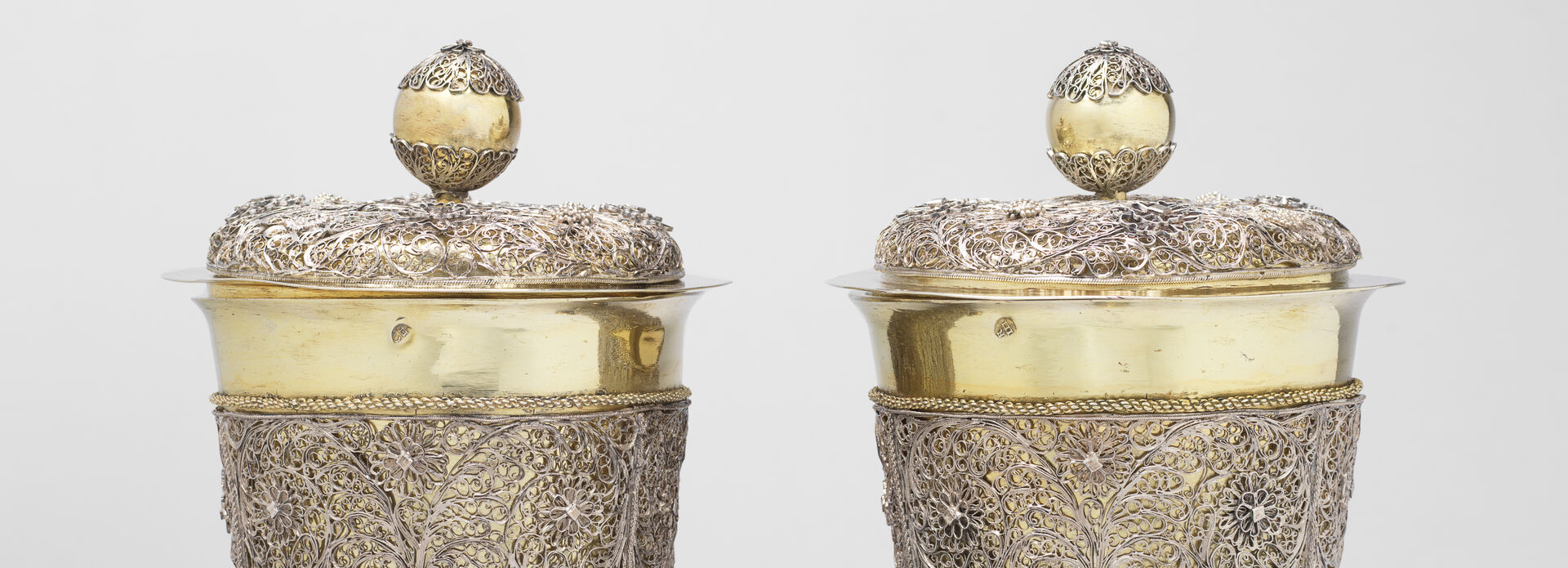 De två filigranbägarna med lock i förgyllt silver, tillverkade av Rudolf Wittkopf (d. 1722) i Stockholm 1698, är inte bara framträdande exempel på svenskt guldsmide från 1700-talets slut, de kan också berätta om ett dramatiskt skede i de diplomatiska förbindelserna mellan Sverige och Ryssland. Bägarna ingick i den gåva som överlämnades till tsar Peter I av den svenske kungen Karl XII:s ambassadörer hösten 1699.