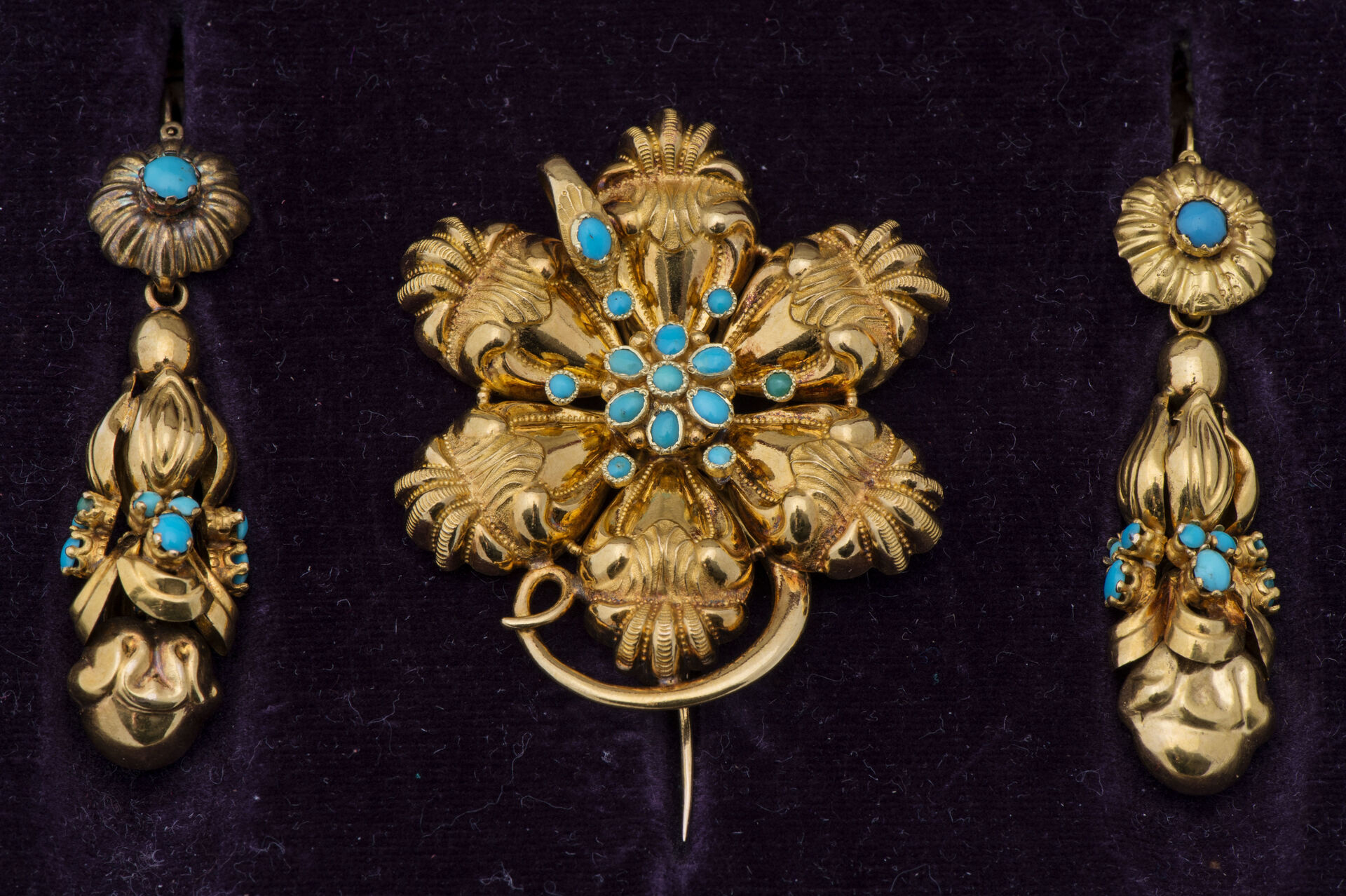 Another example of the simplification that is characteristic of middle-class jewellery in the first decades of the 19th century is the tendency to replace expensive gems with less precious varieties, such as citrines, topaz and turquoise. To achieve the greatest effect with the least possible gold, it was rolled into thin leaf or drawn into long wires. This more economical way of making jewellery seems to have appealed to the new Bernadotte dynasty in Sweden, who ordered prolific quantities from Daniel Marc Giron (1784– 1858) in Stockholm, to be used as gifts. His workshop was the originator of the cravat pin with King Karl XIV Johan’s profile in gold, decorated with five antique-cut diamonds and eight rose-cut stones, made in 1819. The following year, Giron, who was from Geneva, Switzerland, made his son in law, Olof Wilhelm Löngren (1794–1861) his business partner. The company Giron & Löngren were the makers of two other acquisitions: the gold and turquoise earrings and matching brooch from 1832 in a style that was very typical of the period (Fig. 5), and a bracelet with an oval agate cameo of the young Hercules, set in a filigree frame and a chain decorated with beads (NMK 20/2016).6
