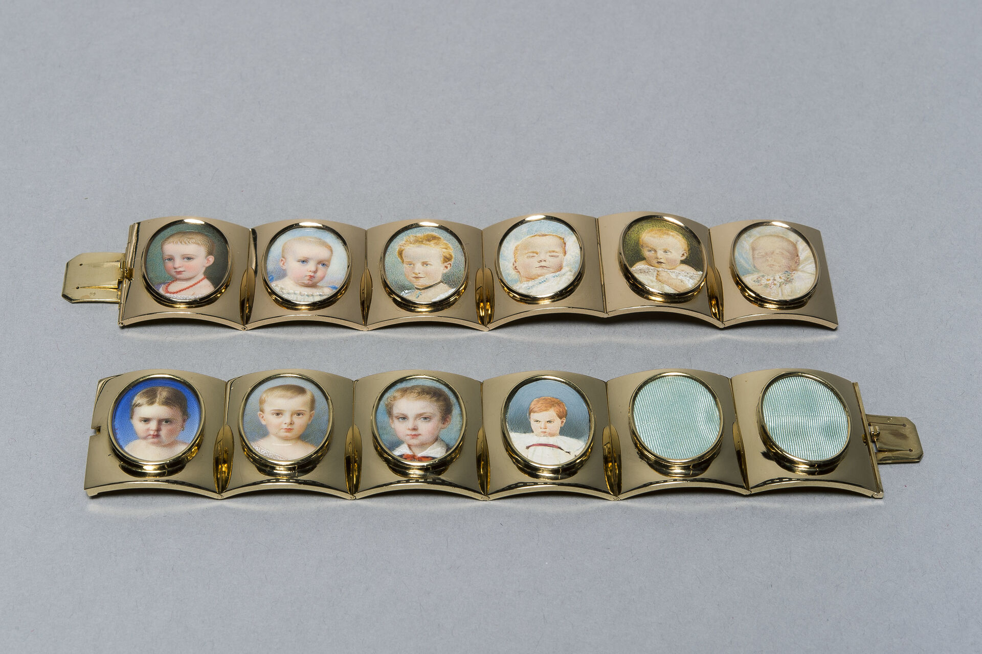Developments in Sweden obviously reflected the major international trends. The leading company was Mellerio Père et fils, known as Mellerio, dits Meller. This firm was founded in Italy and had operated in Paris since the 17th century. Its major rise in popularity came with the so-called July Monarchy (1830–1848) in France, under King Louis Philippe I. Last year, the Nationalmuseum was able to acquire two gold bracelets from Meller that had once belonged to Louis-Philippe’s wife, Queen Maria Amalia(1782–1866) ( Fig 7). It is said that the French queen wore one of them on her deathbed. These gold bracelets are very plain and entirely smooth, and each one is divided into six faintly curved segments connected with hinges to form a circle. They are set with six oval miniature portraits, some with locks of hair under the glass on the reverse. Each miniature shows her grandchildren, whose father was Antoine d’Orléans, Duke of Montpensier. The bracelets were then passed down to the queen’s direct descendants.9