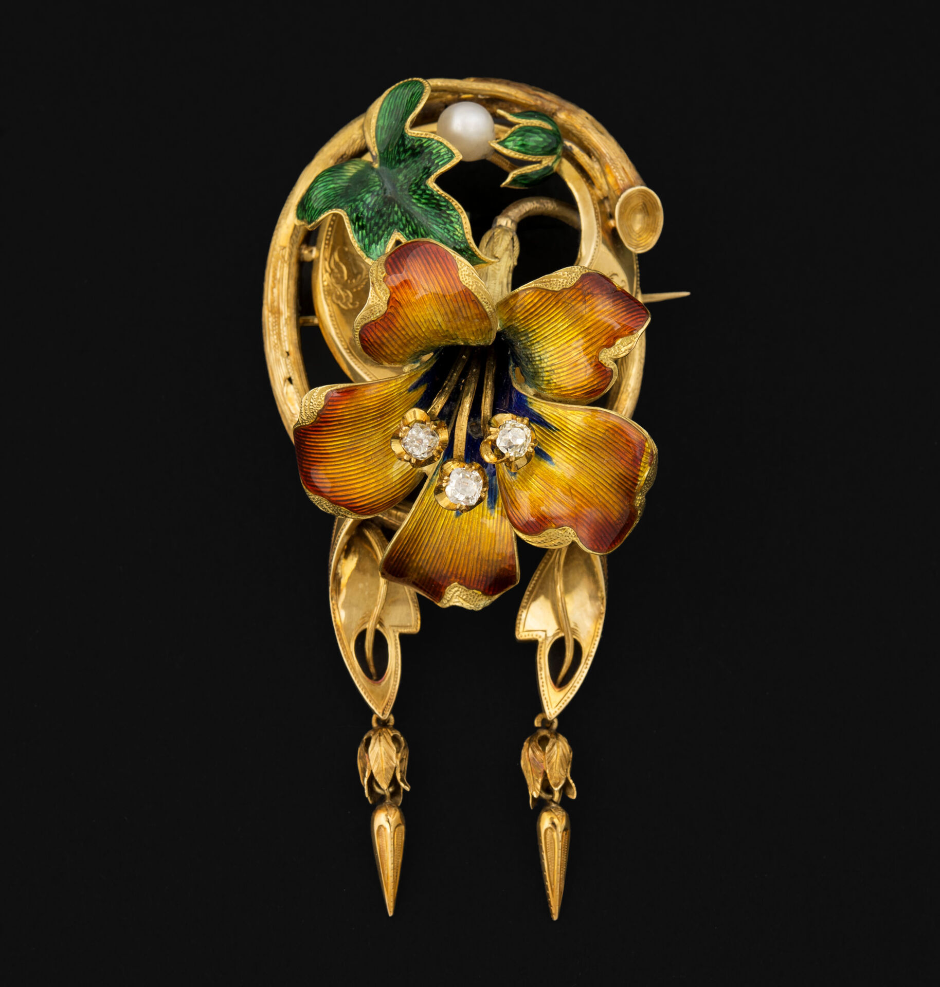 The popularity of the jewellers Mellerio persisted throughout the Second French Empire (1852–1871). The firm became famous, for instance, for its highly skilful naturalistic renderings of flowers made of enamel and gems. A recently acquired brooch exemplifies this Meller quality, designed as a large, orangeshimmering orchid in gold and enamel with diamond pistils (Fig 8).10 Another variety of this naturalism was jewellery in the form of flowers set with diamonds; an ingenious device enables the parts to quiver, enhancing the illusion of real plants.11 These were often brooches, called trembleuse for their moving parts (Fig. 9). Last year’s acquisitions include one such brooch, set with a large number of old cut diamonds.