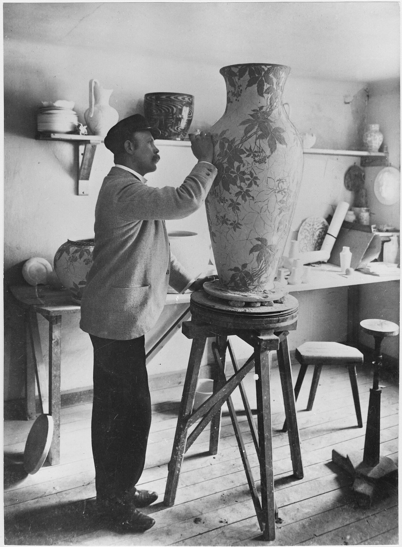 Gunnar G:son Wennerberg’s interest in nature and botany led to designs for so-called 'window gardens'. During the 19th century, the general became more interested in gardening. As living conditions improved, with homes now heated and sporting large windows, there was a boom in indoor cultivation of flowering pot plants and tropical palms. Seeds, plants, and bulbs from all over the world were readily available to customers. Nature moved into people's homes! Pots and pedestals became important parts of interiors. As a result, Gustavsberg’s range grew. Many of the factory's most spectacular goods from the turn of the twentieth century were designed by Wennerberg.