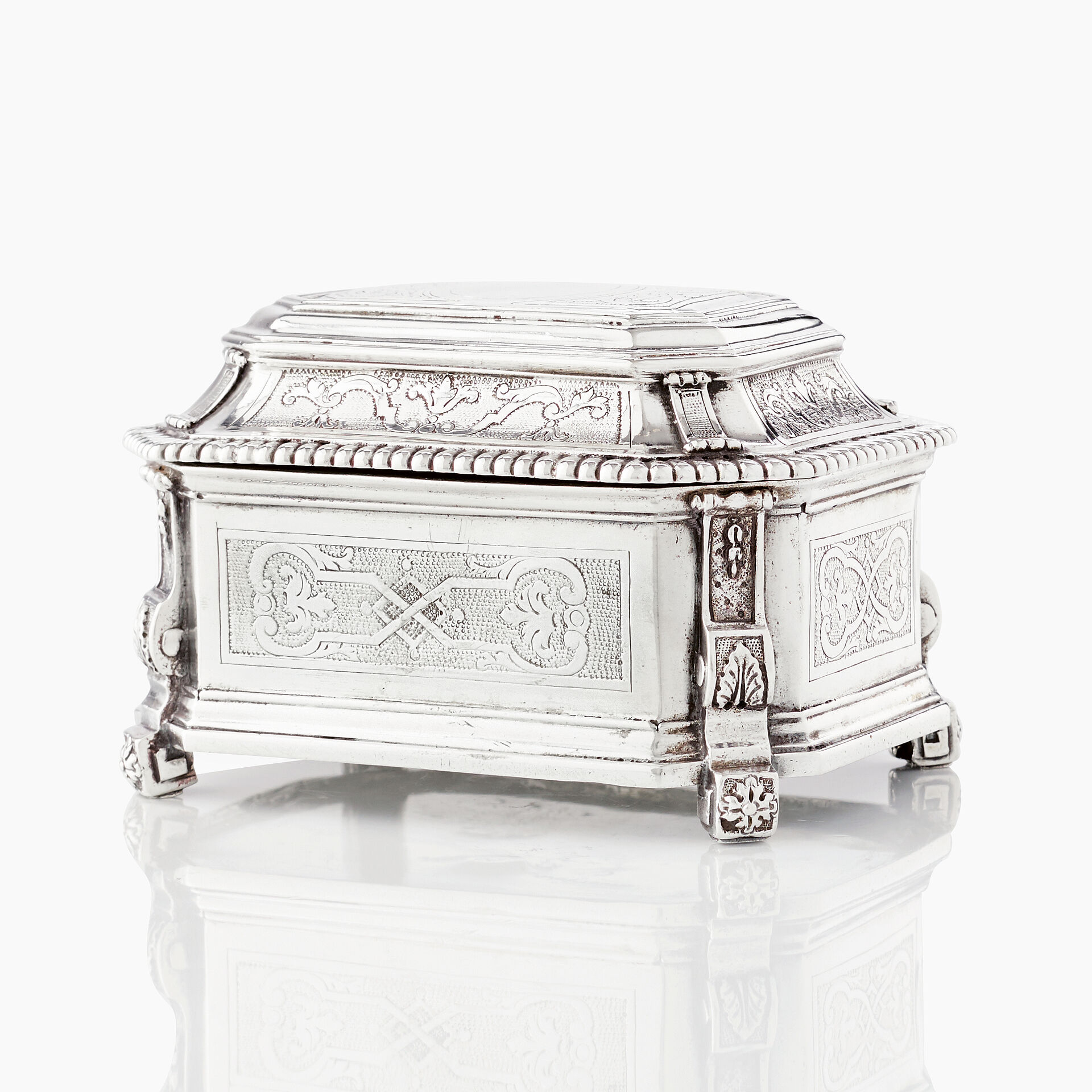 The first of the two silver artefacts acquired by Nationalmuseum is a chocolate serving pot made in 1715 by Petter Henning in Stockholm. This was a new type of artefact, designed for hot chocolate. The first occurrence of the word choklad (‘chocolate’) in the Swedish language was in 1688. The drinking chocolate of the time would not be recognisable to us today, but was a viscous mixture containing chocolate, egg, milk, sugar, vanilla and various spices. As the mixture had to be stirred vigorously, chocolate pots had a hole in the lid so that a whisk could be inserted without the drink getting too cold. The newly acquired piece has a removable knob on the lid with a bayonet closure to cover the hole. It was commissioned by a member of the noble Oxenstierna af Eka och Lindö family. Drinking chocolate was believed to have medicinal properties, being good for the appetite and the mind and an excellent aphrodisiac.From the same silversmith’s workshop is a jewellery box also dating from 1715. Although only 6½ centimetres in height, the design is monumental. The late baroque design, with oblique corners decorated with brackets, and the ornamentation, with well-rounded edges and embossed patterns, were very modern for their time. An embossed coat of arms inside the box reveals that it was commissioned by a member of the noble Lorichs family.
