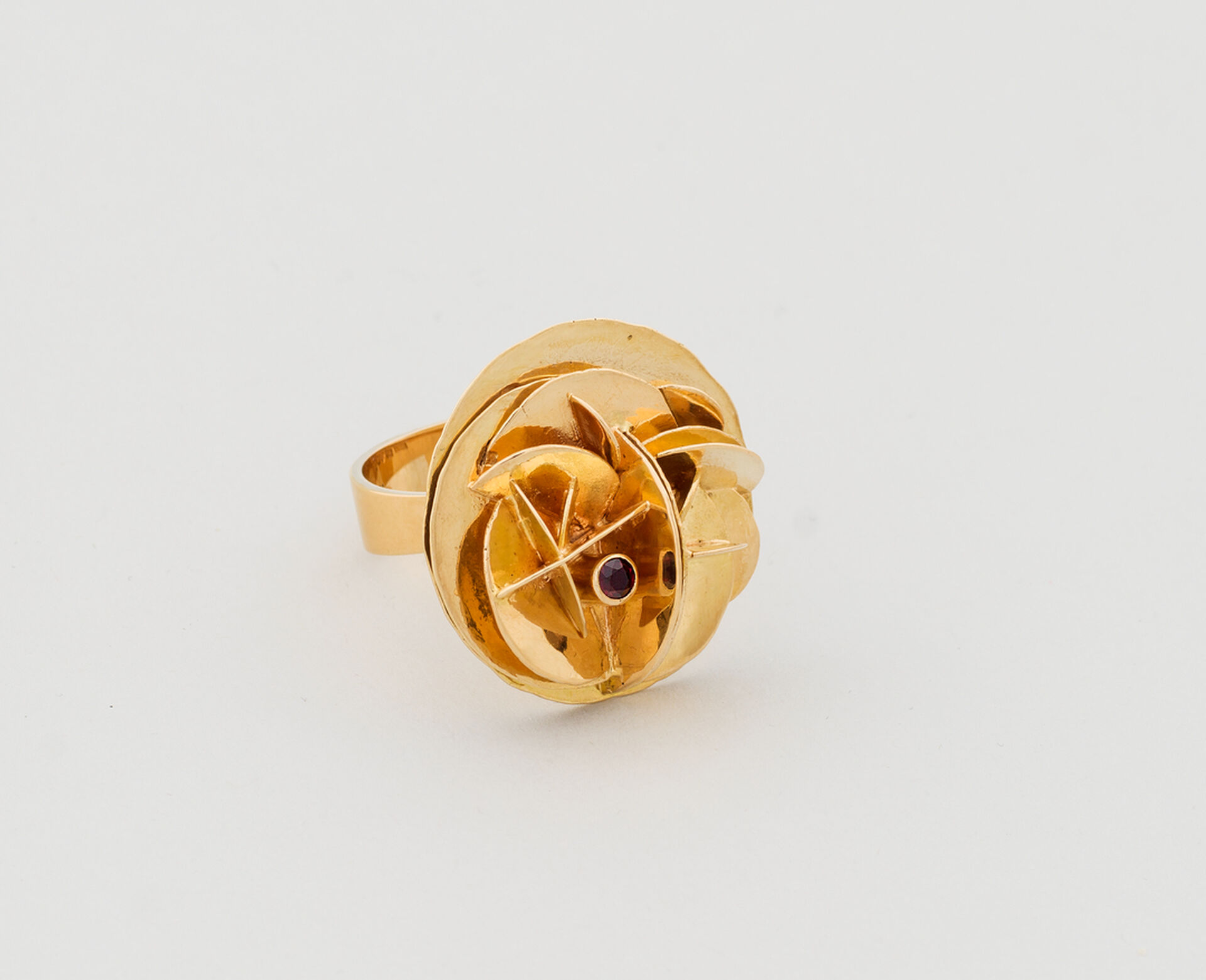 Kerstin Öhlin Lejonklou, Torbjörn Armgård, ring with case “Sahara”, 1974. Gold, ruby. Brown velvet case. NMK 48/2023.