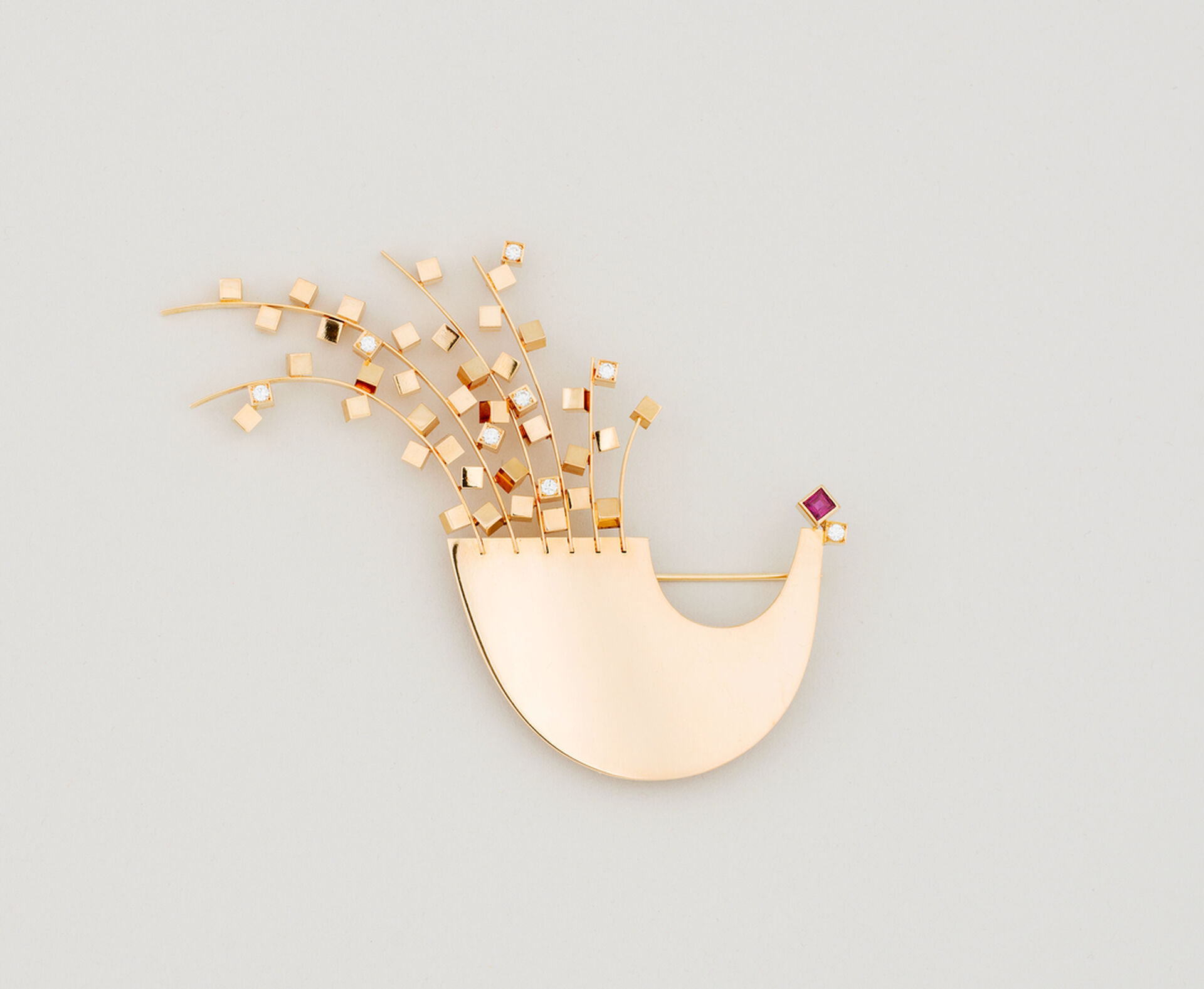Kerstin Öhlin Lejonklou, Lena Olofsson, brooch “Coq d’or”, 1989. Gold, ruby, brilliants. NMK 50/2023.