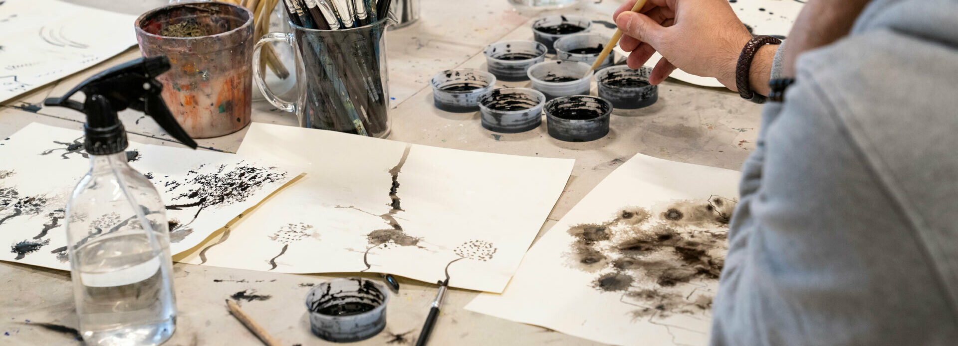 Explore all the possibilities of deep black ink – from quickly spreading blots to elegant arcs and delicate lines on dry or wet paper.