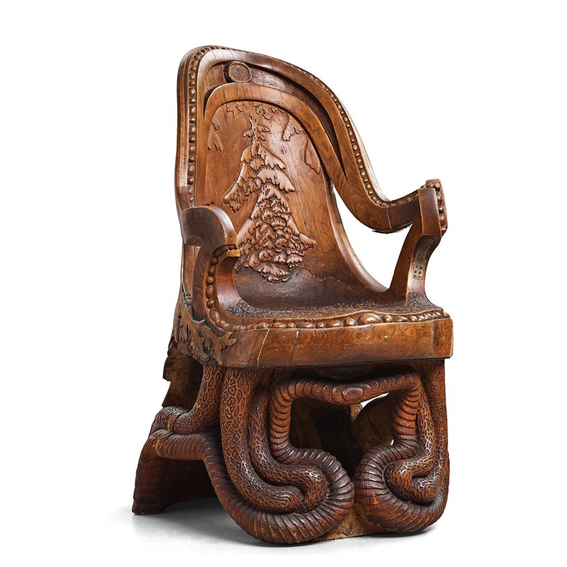 Nationalmuseum has recently acquired a so called “stabbestol” chair with large snow-laden branches build up the back. This unique chair was designed and carved by Knut Fjaestad and took seven years to manufacture and it was completed in 1915. The length of the process earned the chair its name, The Seven Years’ Throne.