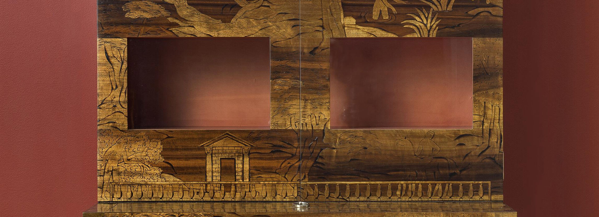 The cabinet is made with inlaid wood, which means that patterns have been created using different types of wood in thin veneer. The motif is paradise, where Adam and Eve are living among exotic plants and animals. The untrustworthy snake wriggles on the lid of the writing board, tempting them to eat the apple that grows in the Tree of Knowledge. The material is lavish. The inlaid wood on the sides and doors of the cabinet is made of Brazilian walnut, eucalyptus and tropical olive wood, while the writing board is made of African ebony. The cabinet doors feature glass of different geometrical shapes, and the light-red leather the cabinet is decorated with is visible inside of these. At the 1925 Paris Exhibition, the shelves held objects such as engraved glass from Orrefors. The handle, key and fittings are made of silver-plated metal.