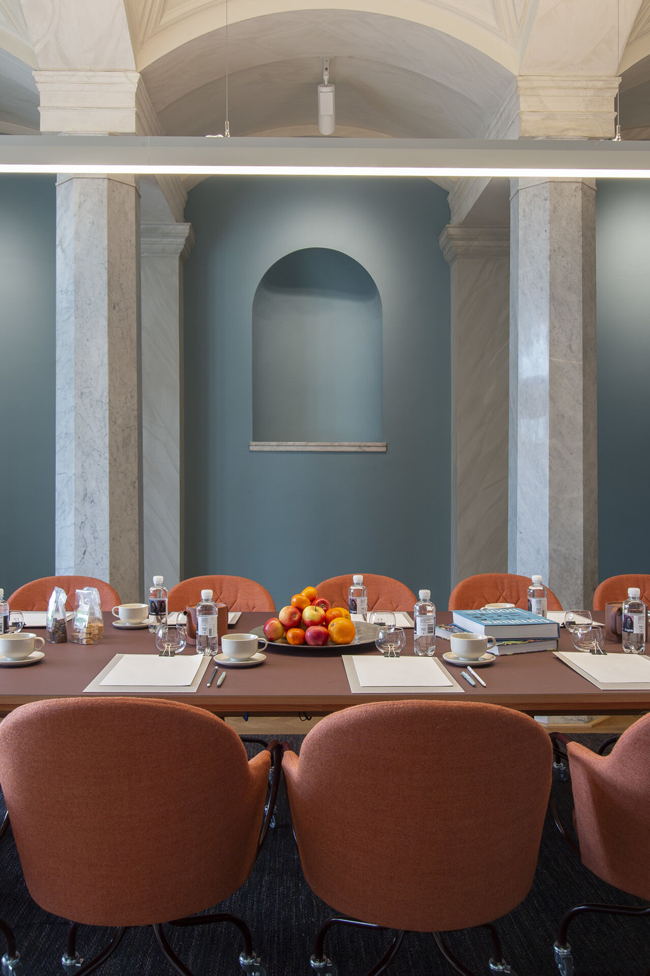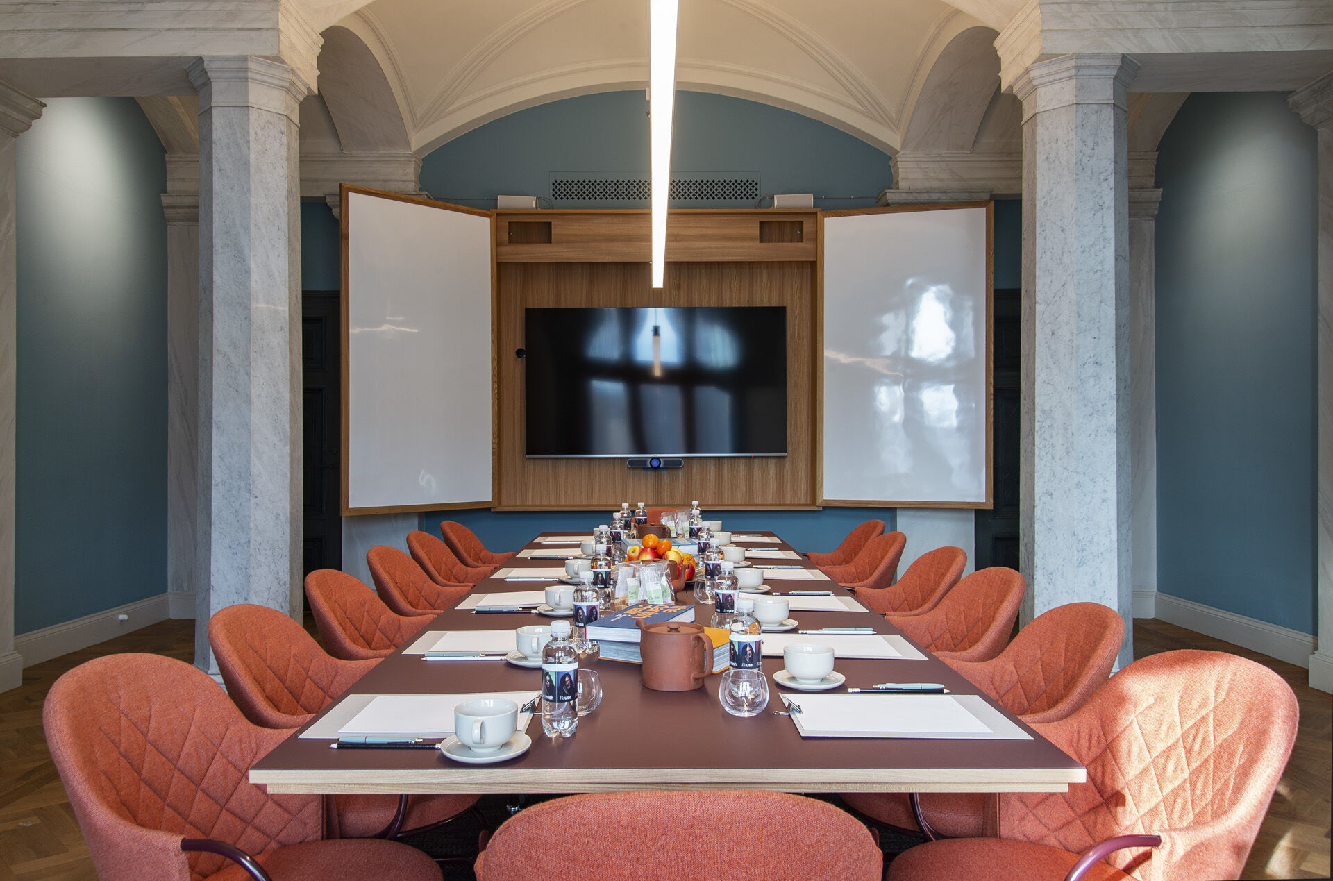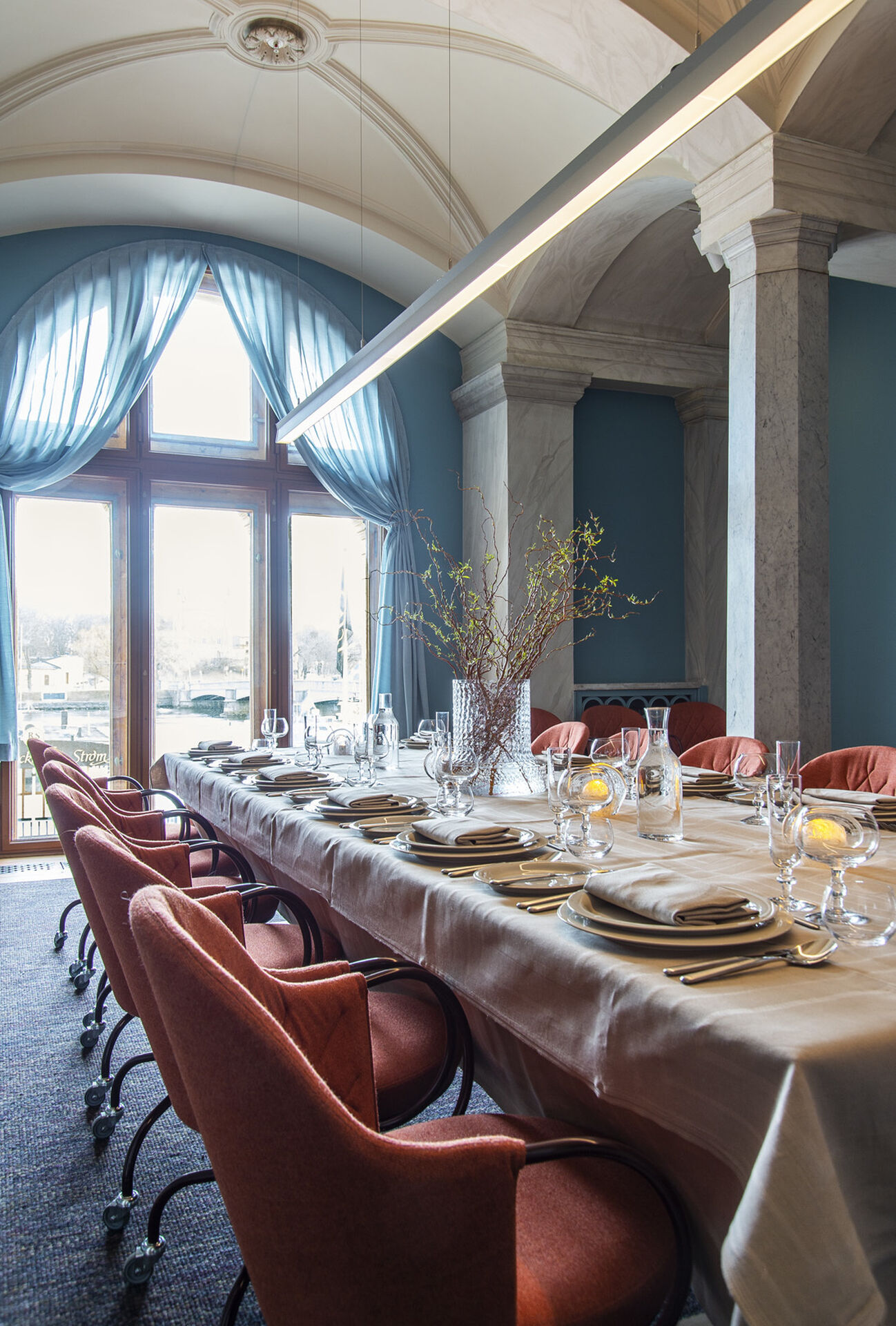 The Session Room was once a meeting room for the museum's management. Now, it can be booked by anyone for formal and informal meetings or private functions. The Session Room's interior features warm colours and elmwood carpentry. A large window lets in natural light and offers a beautiful view of Skeppsholmen.