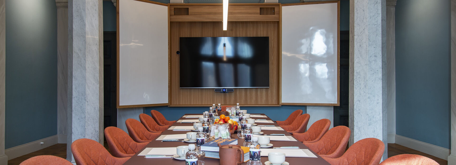 The room itself can accommodate up to 18 people, or 14 attendees in the case of a sit-down meeting or conference.