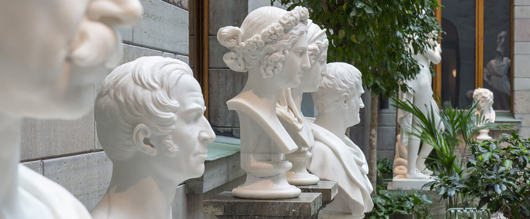 A theme of the Sculpture Courtyard is how art in the 1800s changed from idealism to realism. Thor, Odin and Balder now share the space with successful men depicted as antique philosophers in togas. During the latter part of the century, people began to be depicted more realistically with modern clothes, hairstyles and blemishes.