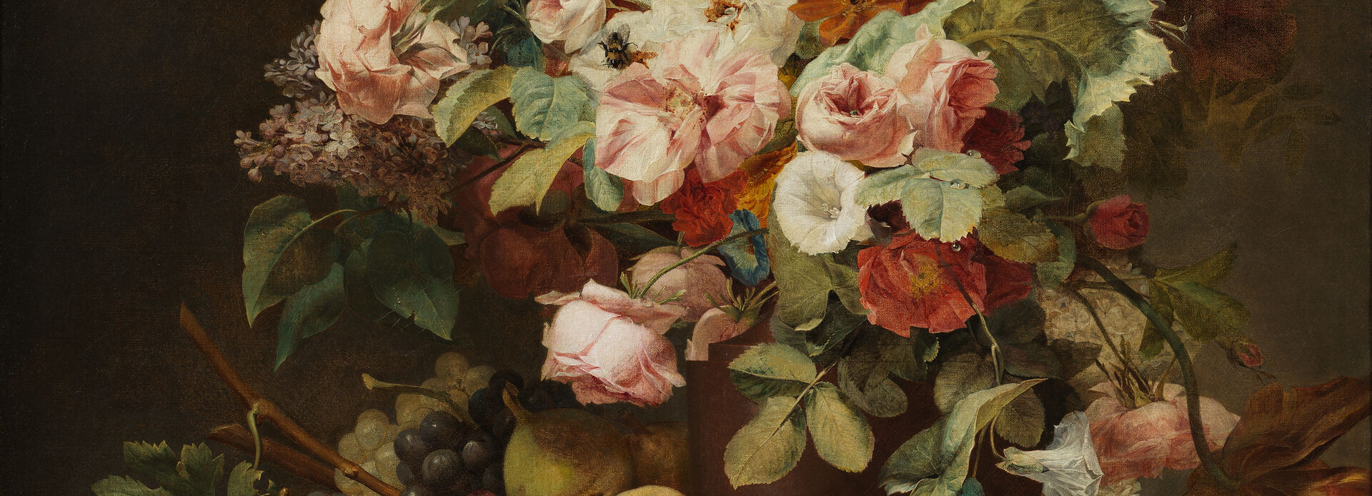 Nationalmuseums nyförvärvade målning är en av Berjons allra största i en produktion som är relativt liten. Detta slags måleri tog mycket tid och stor noggrannhet i anspråk varför storleken och graden av illusionism korresponderade med priset för den färdiga målningen. Antalet blomstermålare var många och kvaliteten lika varierande som på vilken marknad som helst. I målningen syns rosor, pioner, liljor, tulpaner och andra växter i olika stadier av blomning. På bordet står en fruktkorg som svämmar över med persikor, päron och vindruvor. På en av rosorna syns en humla som kanske kan tolkas som en referens till 1600-talets stilleben. Men medan insekterna – skalbaggar och flugor – i de senare ofta står för nedbrytning står humlan i detta fall för växternas reproduktion.