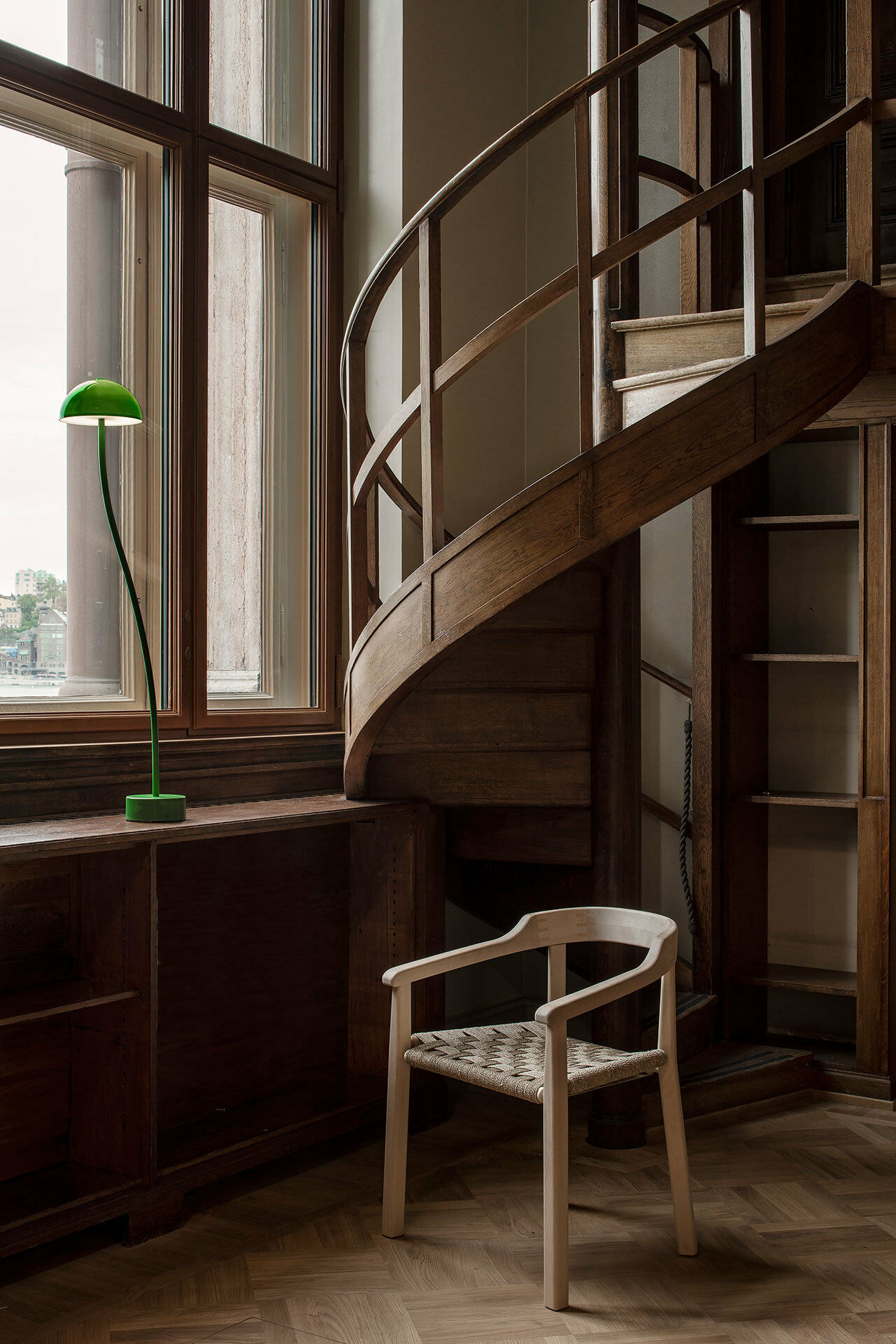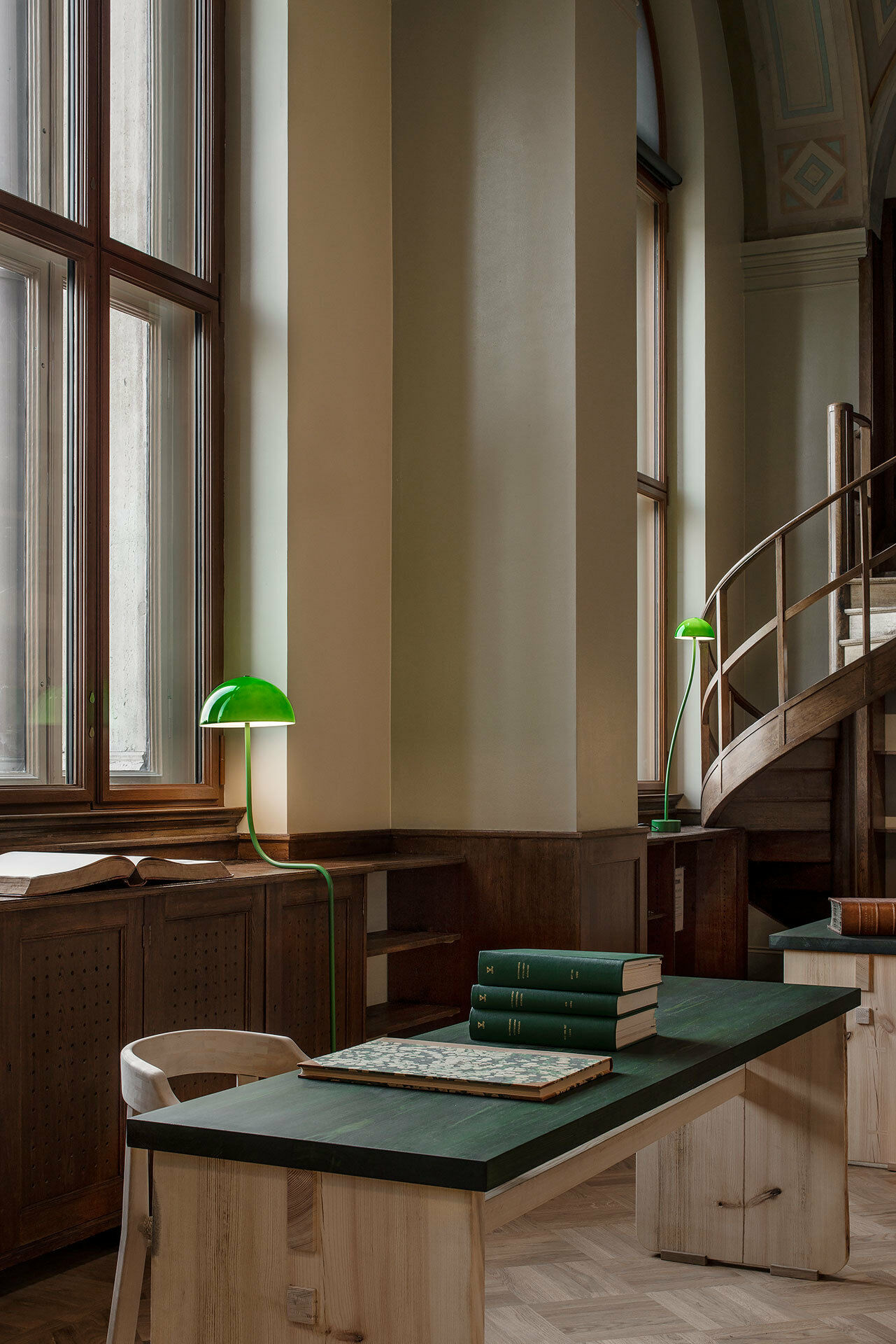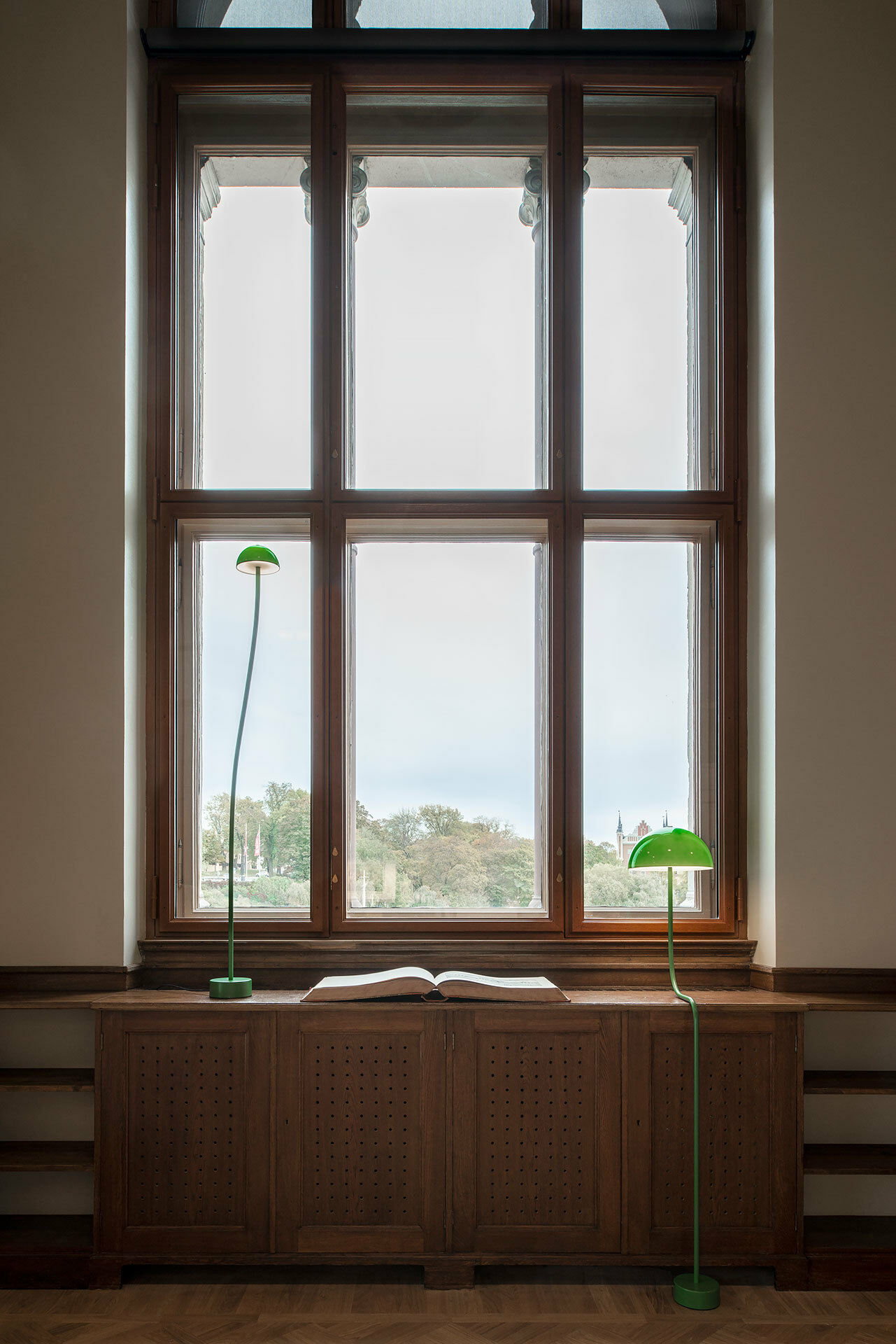 Designern Emma Olbers har inrett Gamla biblioteket med fokus på miljö och hållbarhet. Den 100-åriga inredningen är kompletterad med ny design och den fasta bokhyllan har fått montrar för mindre utställningar. Inspirerad av gamla läsesalar och den biblioteksgröna färgen har Olbers skapat ett rum för vila och reflektion.
