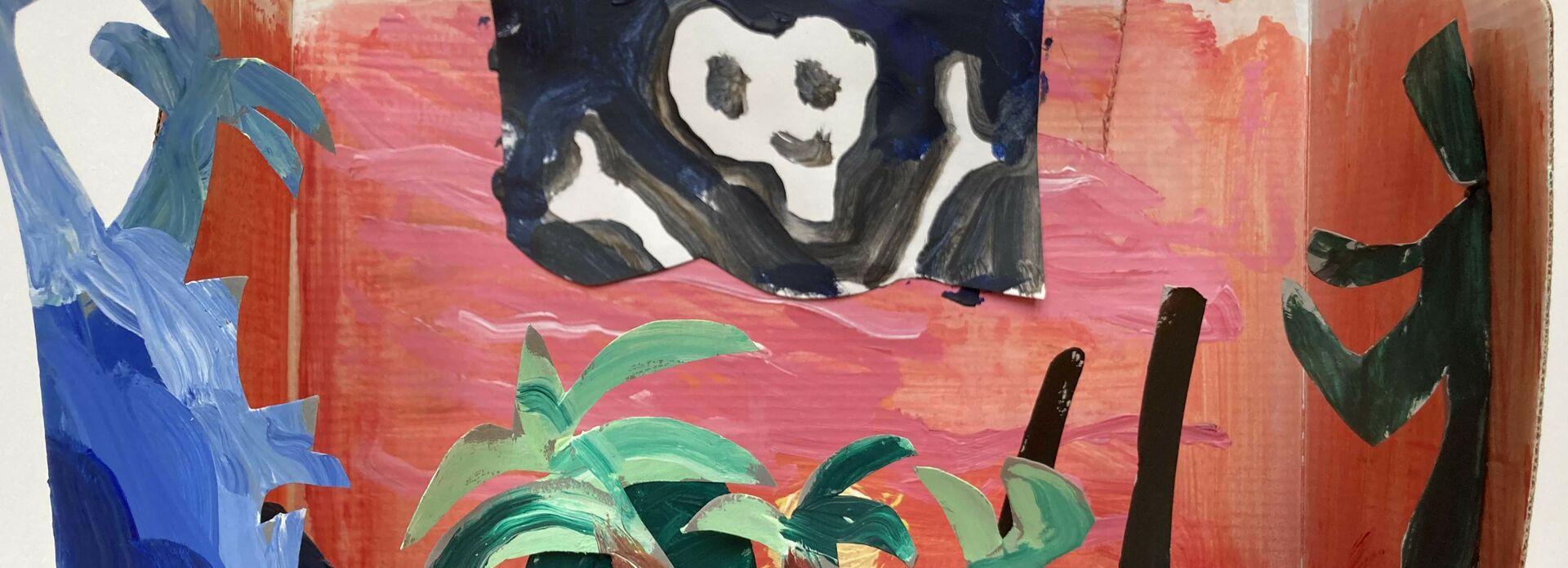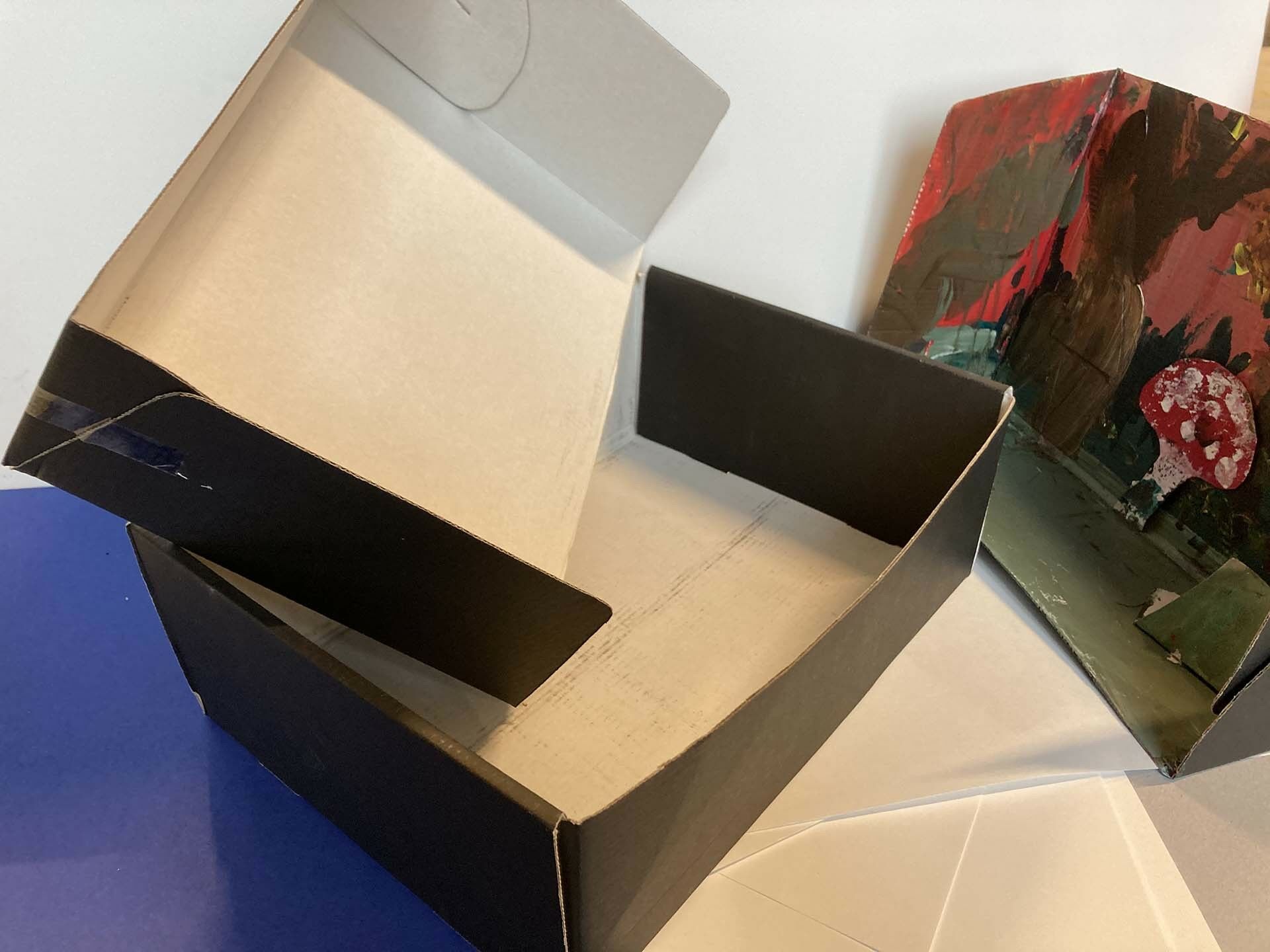 Ställ kartongen på långsidan (det blir stadigast så) och fundera ut en drömplats. Börja måla och rita upp saker, växter, natur och väder på kartongens insida. Du kan bestämma om det är natt eller dag, sommar eller vinter till exempel. Kanske ser du havets hela horisont där inne i lådan, en ljusgrön fotbollsplan eller… ja, vad ser du?