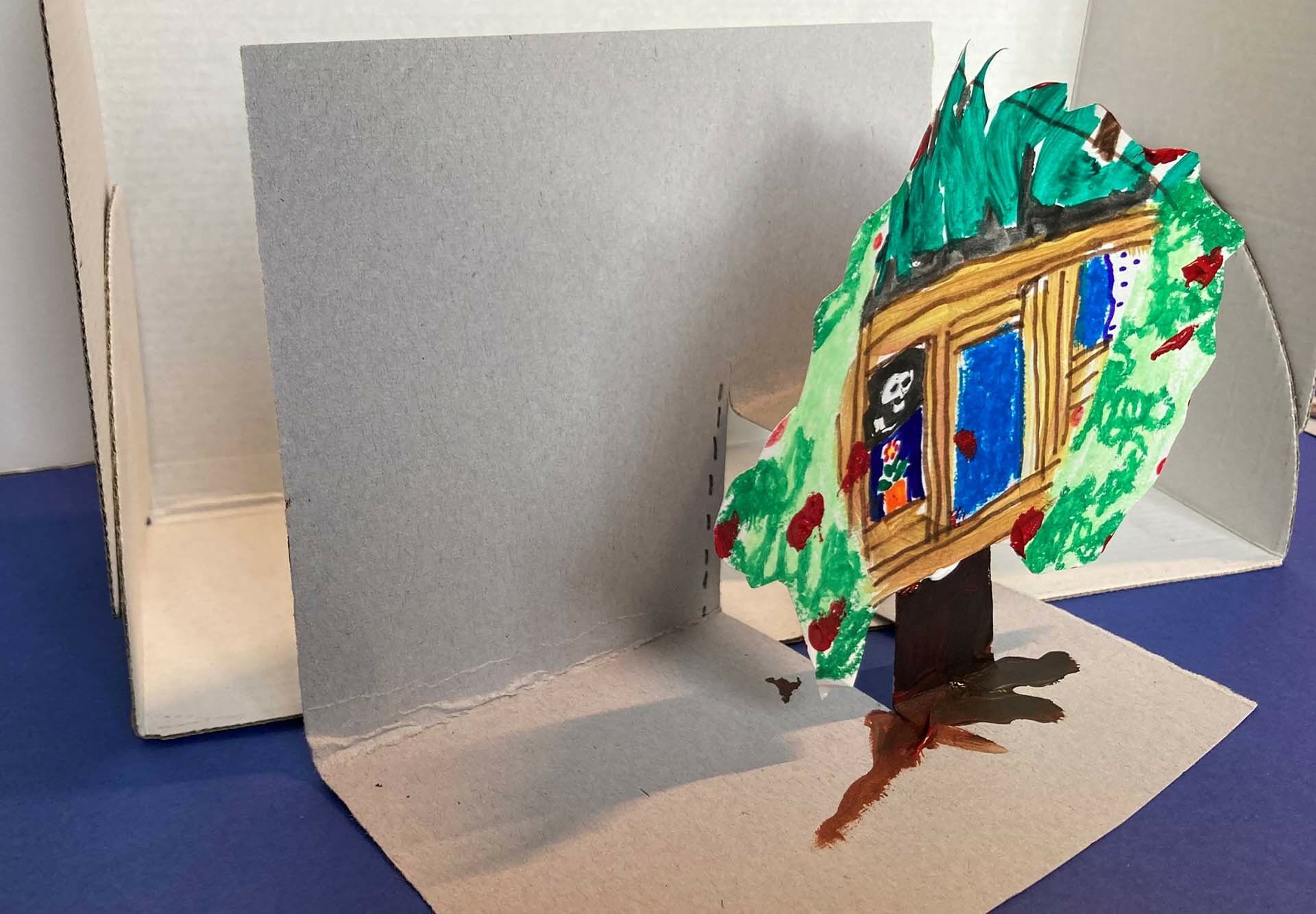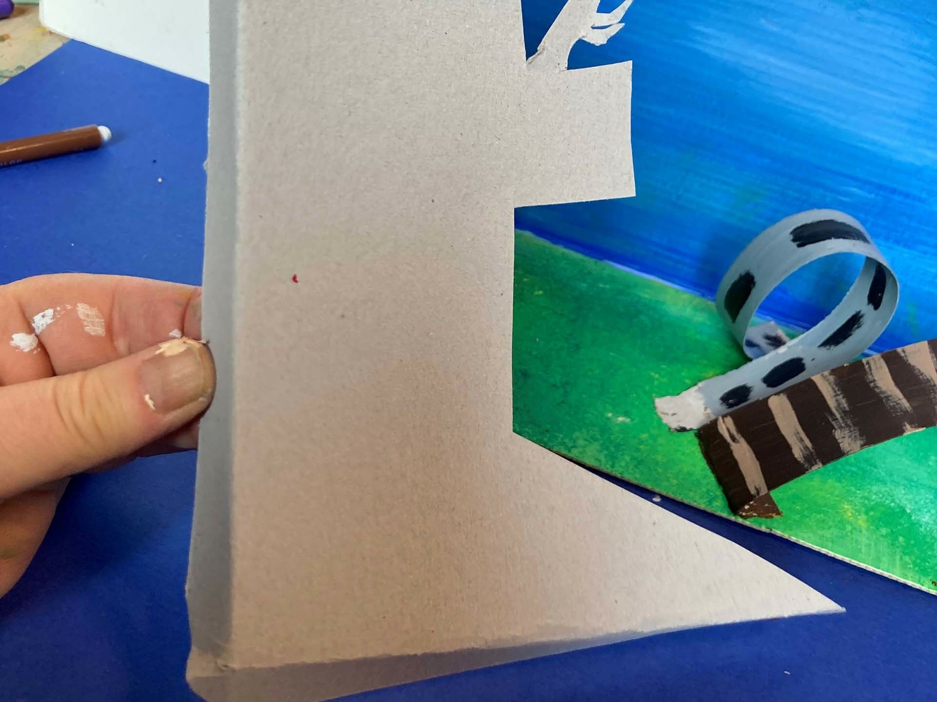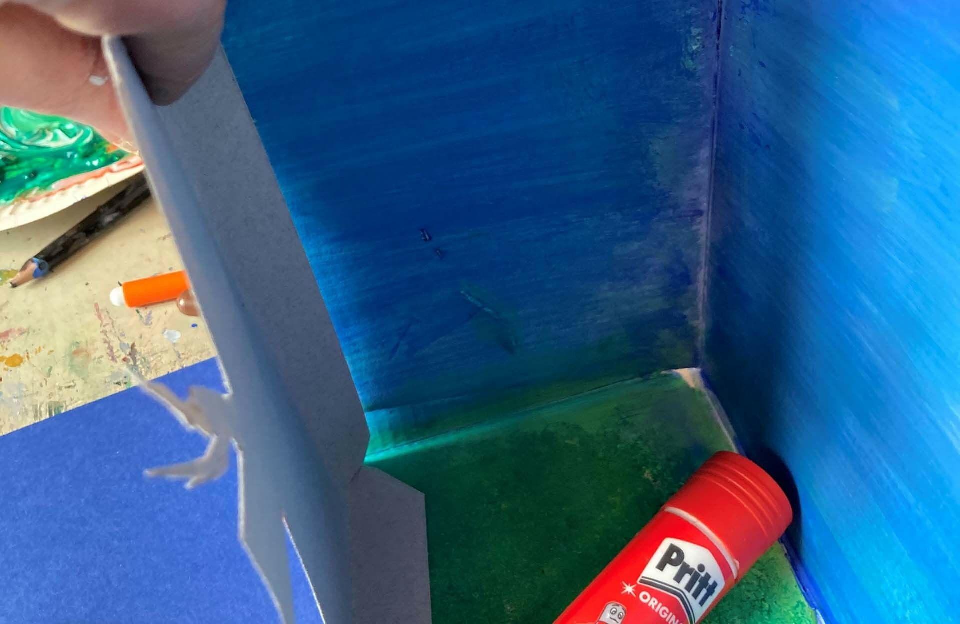 Vik ett hårdare papper på mitten som på bilden och klipp två skåror. Vik upp pappret så du får som ett golv och en vägg och peta ut fliken som du skapat med saxen. Sådär! På fliken kan du klistra fast bilder du målat. Hela pappret kan du klistra fast mot lådans vägg och golv som bilden visar.