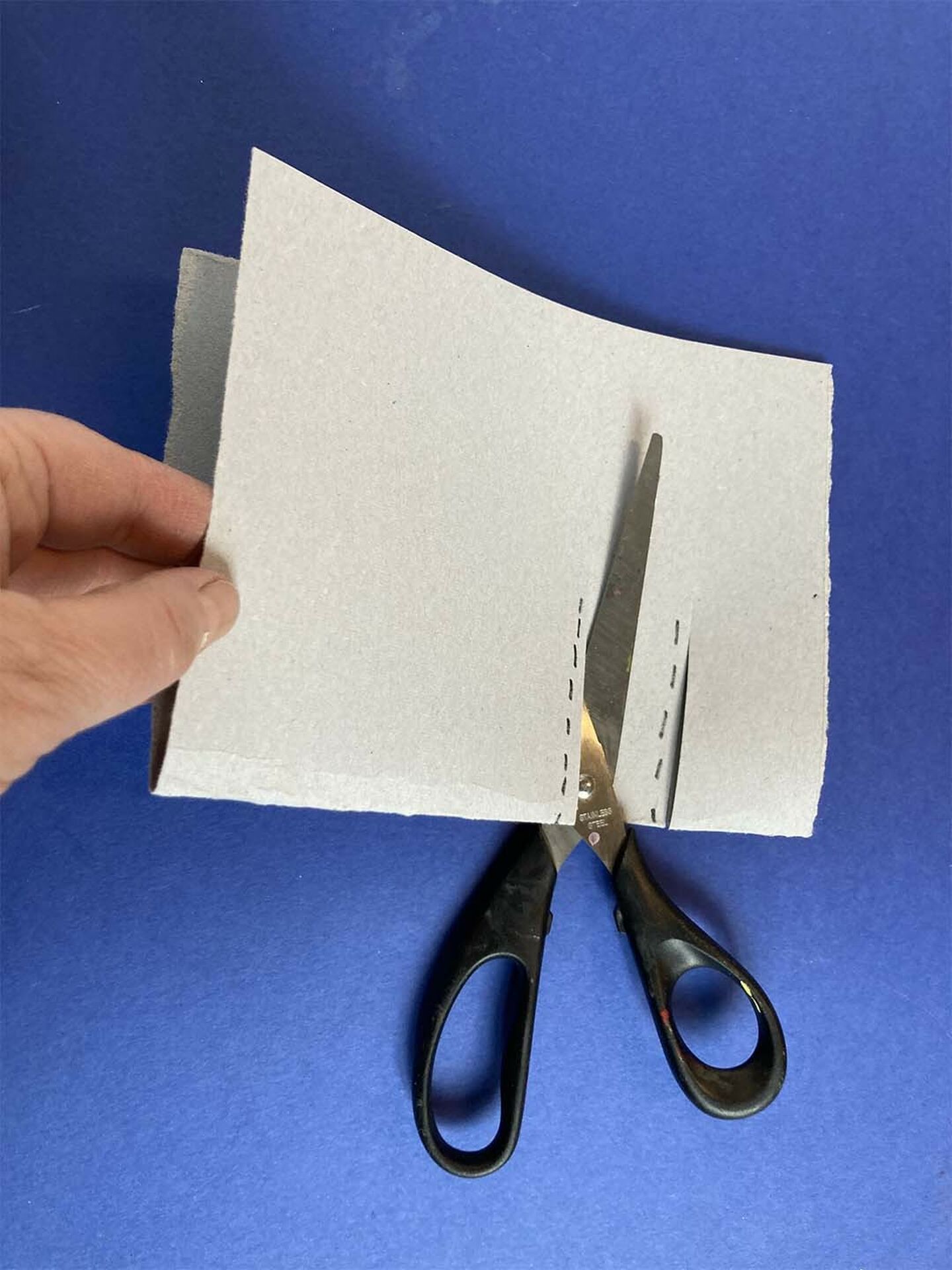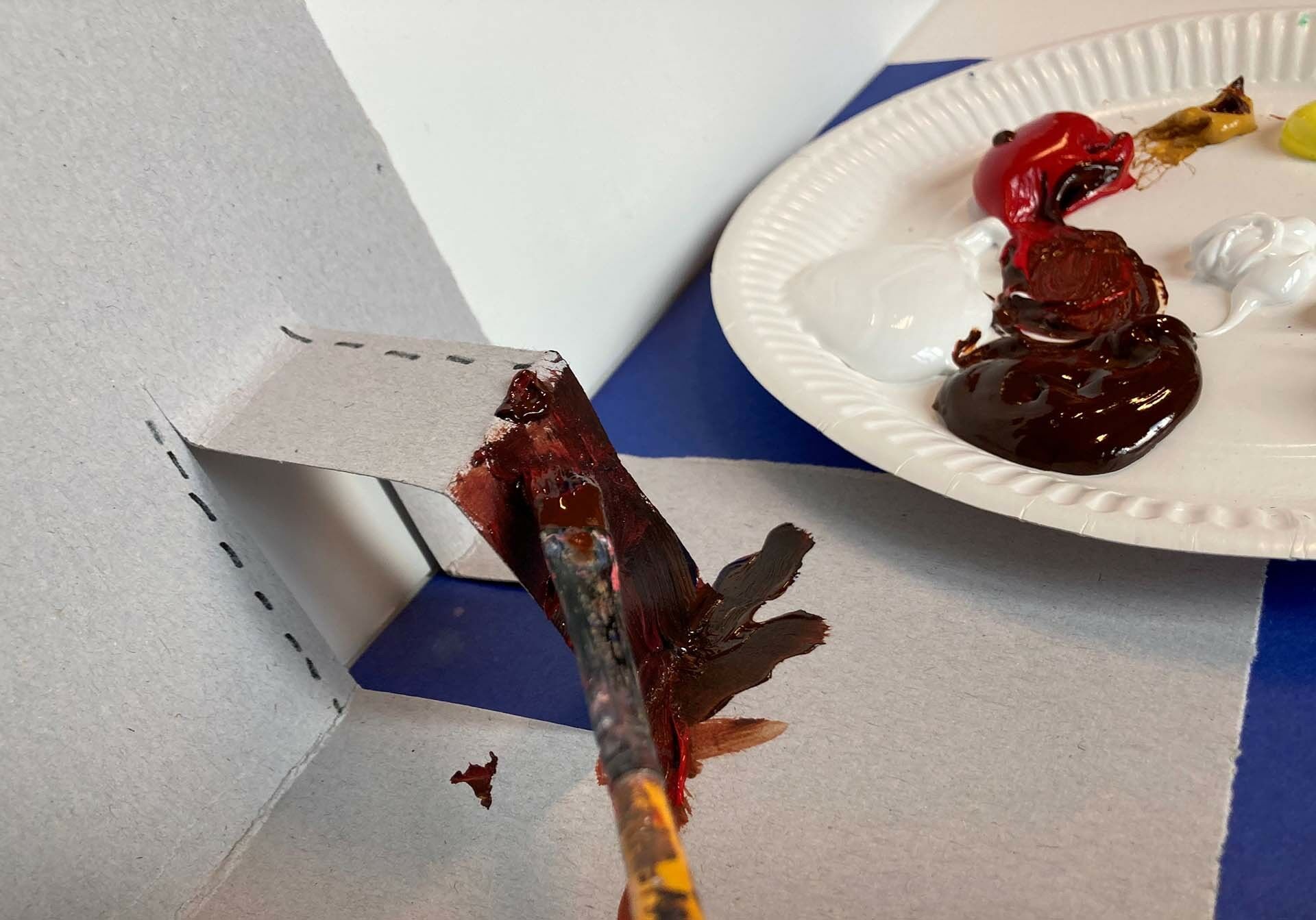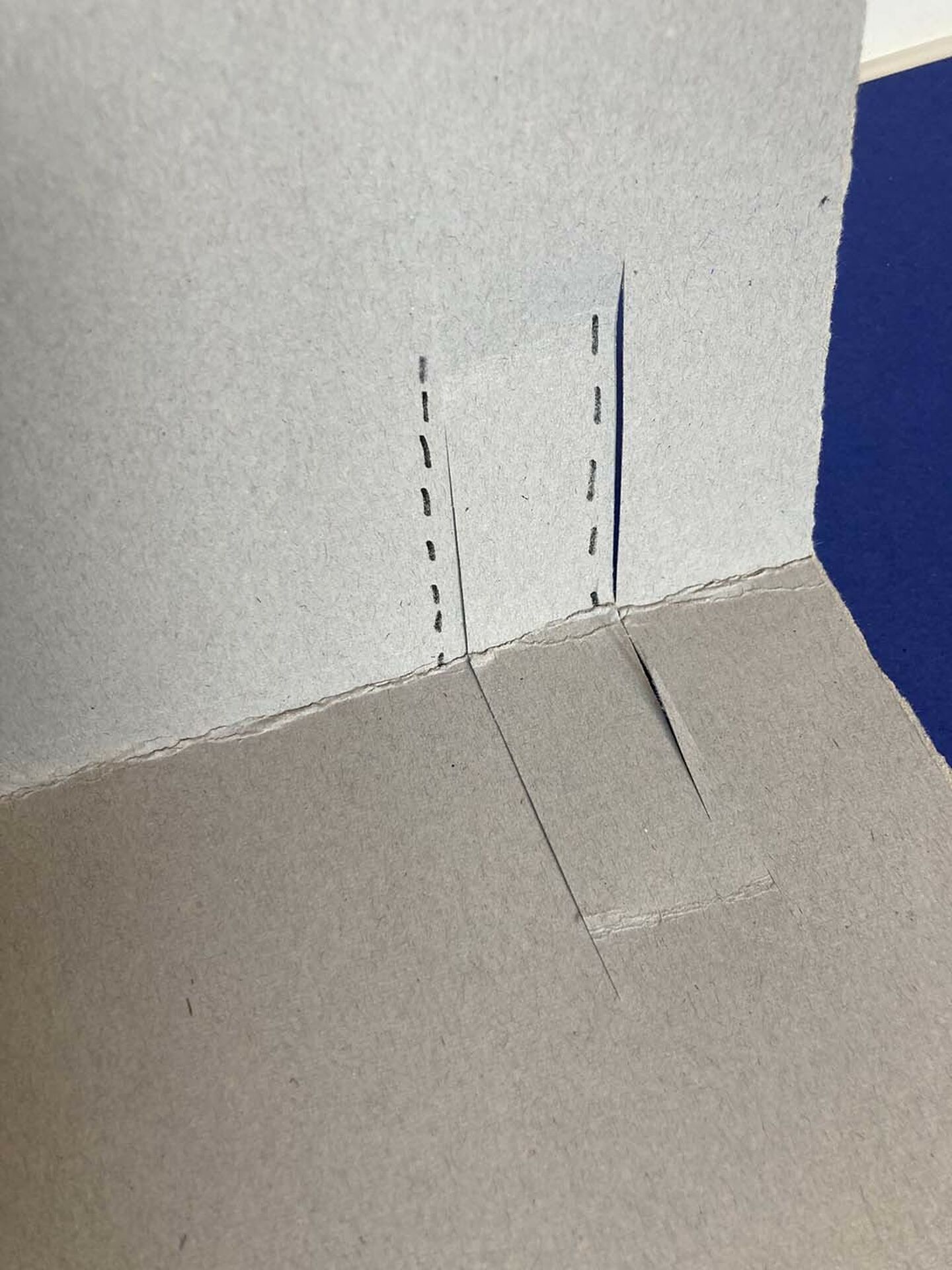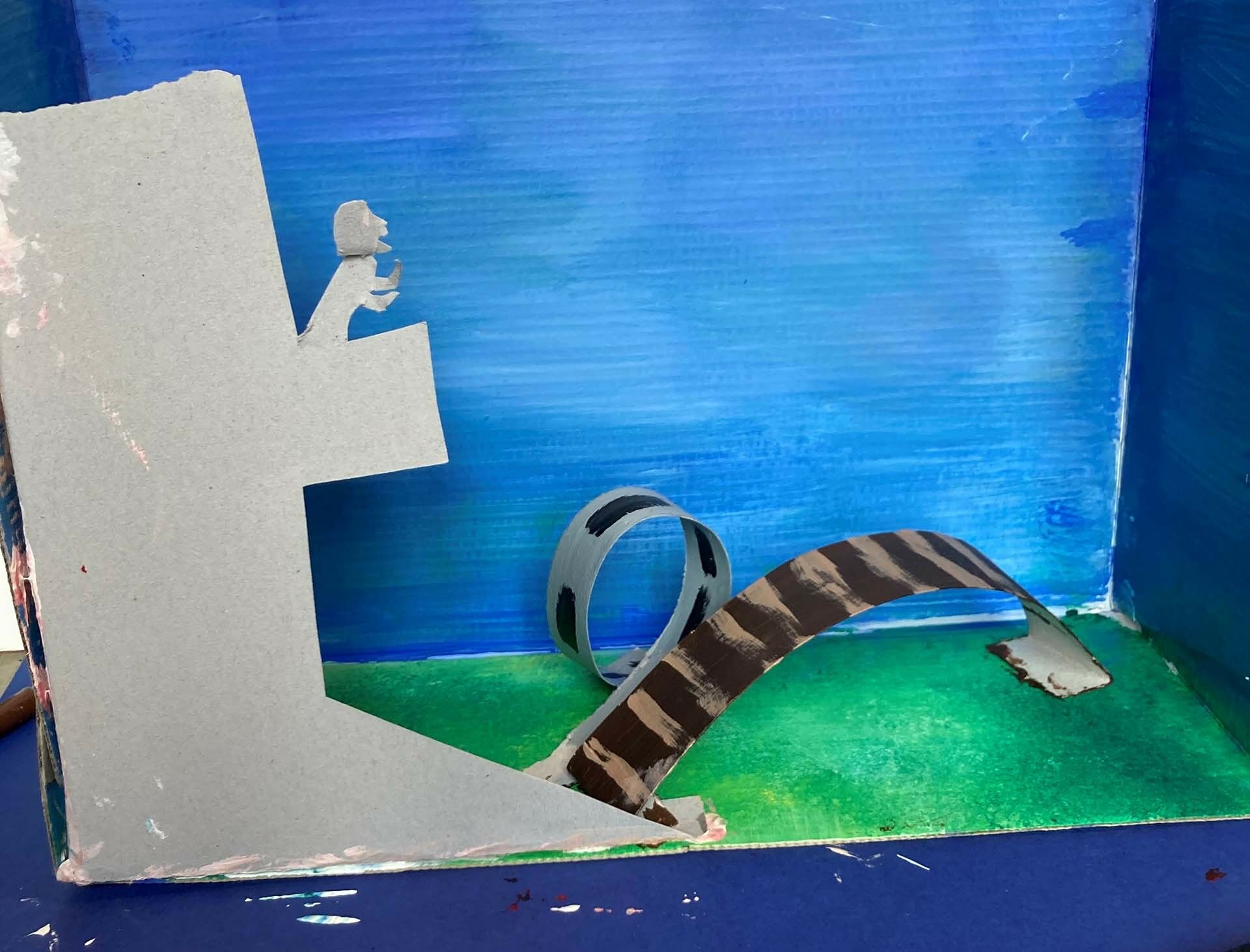 Vik ett hårdare papper på mitten som på bilden och klipp två skåror. Vik upp pappret så du får som ett golv och en vägg och peta ut fliken som du skapat med saxen. Sådär! På fliken kan du klistra fast bilder du målat. Hela pappret kan du klistra fast mot lådans vägg och golv som bilden visar.