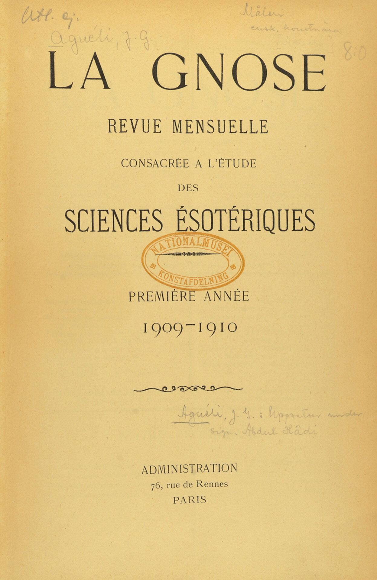 La Gnose är en sällsynt tidskrift som, enligt Nationalmuseums årsberättelse, införlivades i Konstbibliotekets samlingar 1920. Tidskriften grundades i Paris av religionsfilosofen René Guénon för att fungera som ett organ för ”den gnostiska universella rörelsen”. Den gavs ut för första gången i november 1909 och var ”tillägnad esoteriska och metafysiska studier”. I La Gnose behandlades ämnen som musik, matematik, geometri, alkemi och frimureri. Tidskriften kom ut en gång i månaden och det sista numret såg dagens ljus i februari 1912.