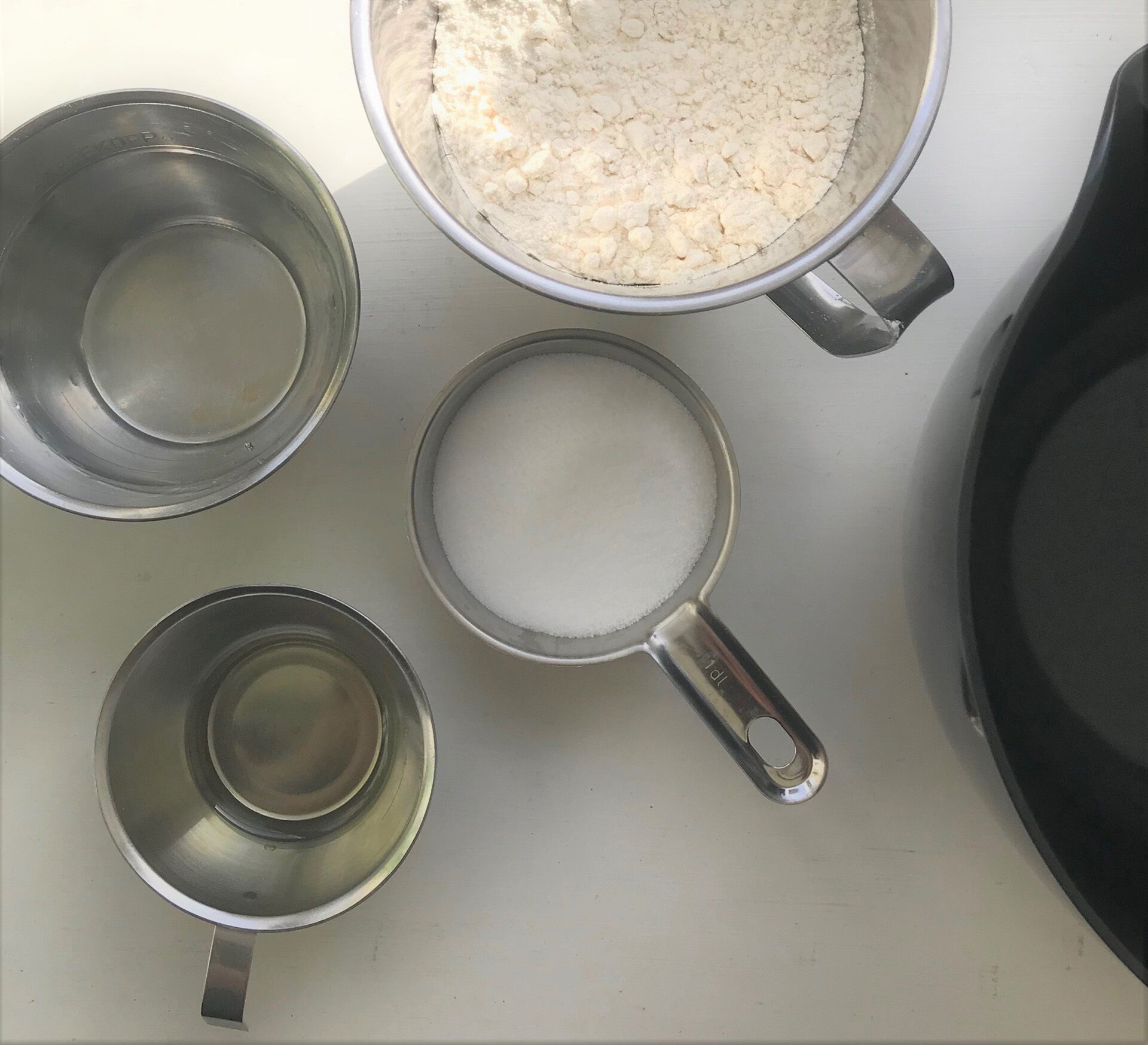 - Blanda ihop vetemjöl, salt, vatten och rapsolja till en deg. Anpassa konsistensen med lite vatten eller olja.
