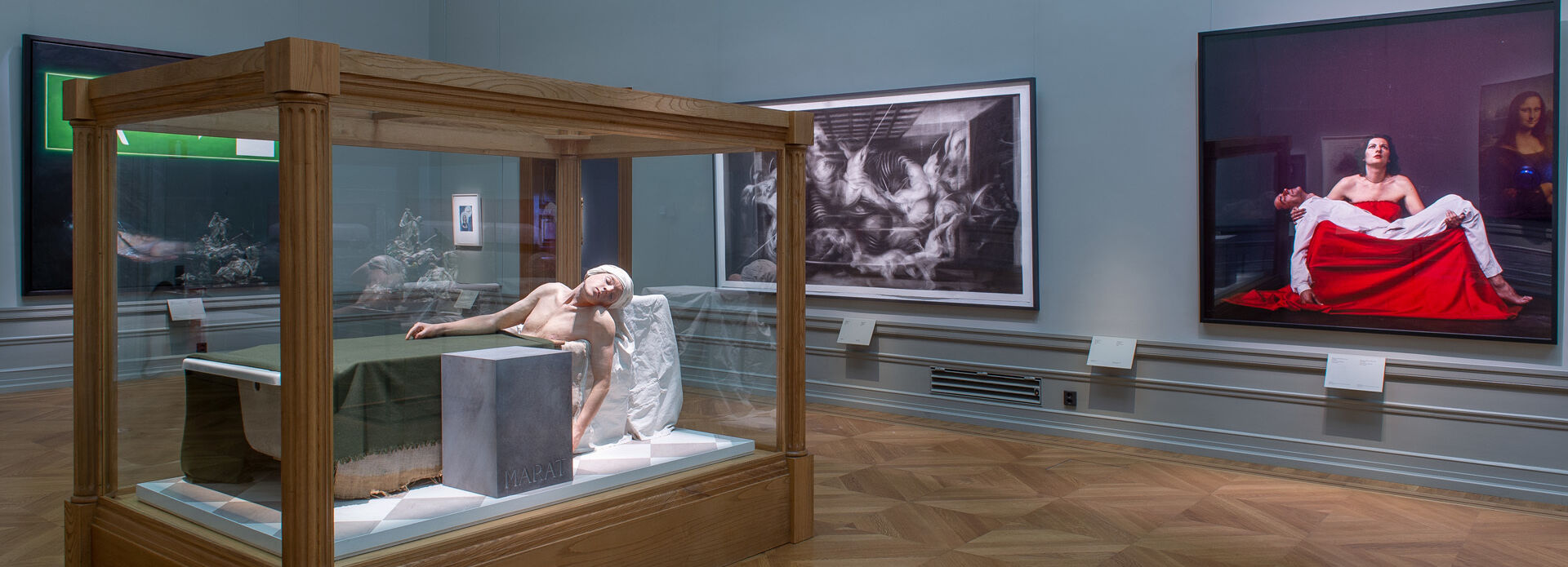 Marats död har sedan 1793 gestaltats av en mängd olika konstnärer. Det mest ikoniska verket – som installationen i Nationalmuseums utställning är en parafras på, målades av Jacques-Louis David bara månader efter att Marat mördats. Han målade Marat som en martyr, nästan som Jesus själv. Radikala revolutionärer skulle ägna honom en kult under de kommande åren och hylla Marat som en hjälte.