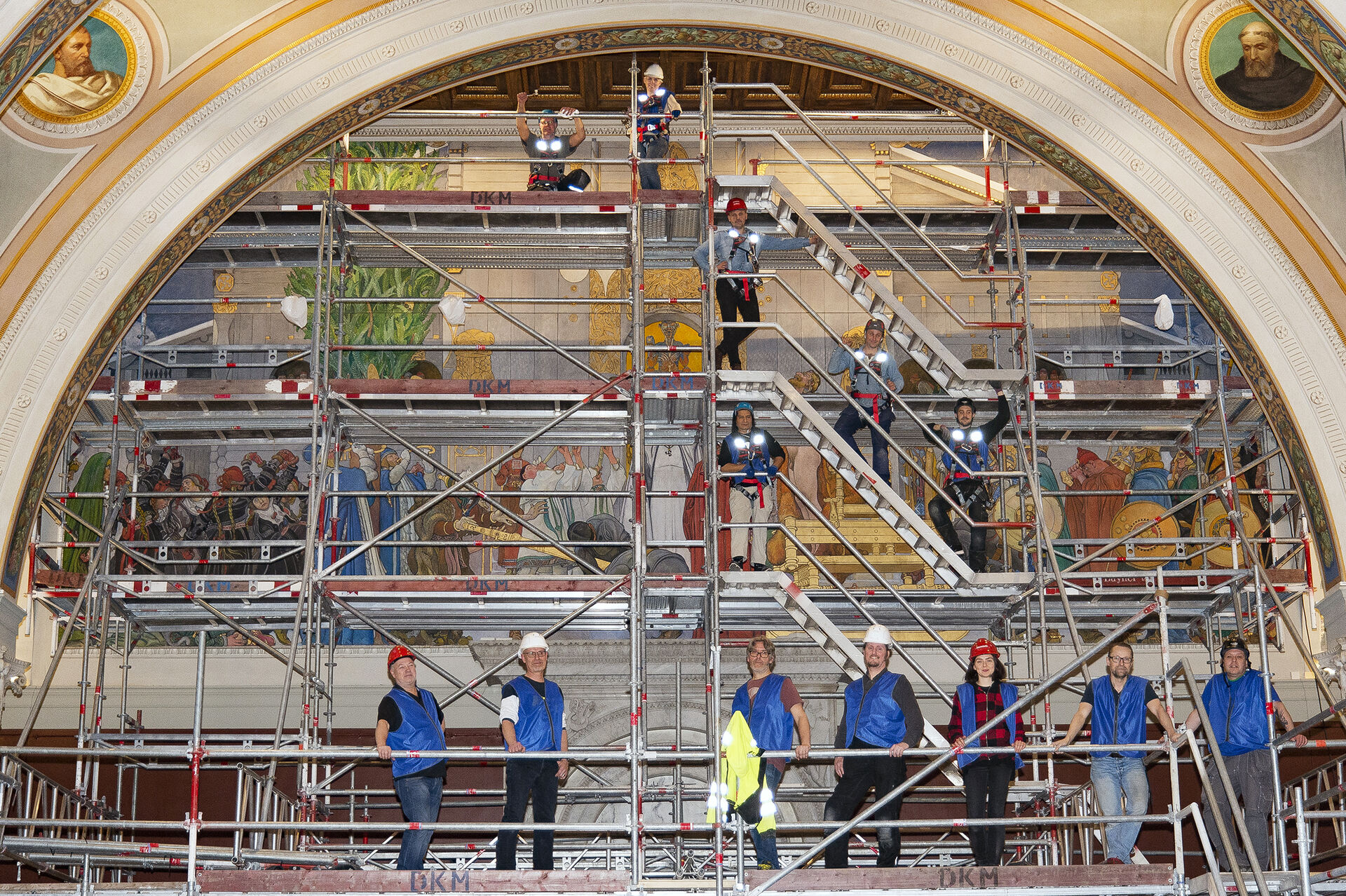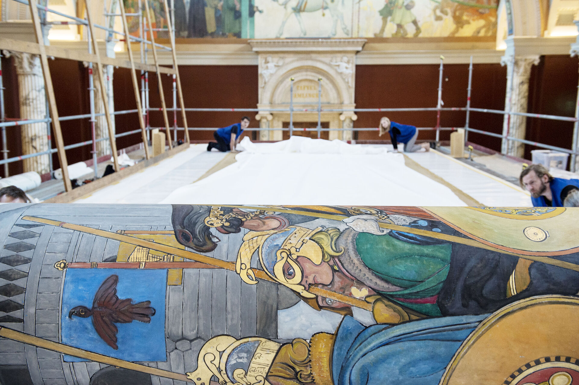 Det behövdes ett 20-tal medarbetare från museet för att dels konservera målningen och få den på plats. Målningen består av två dukar och mäter totalt 6,4 x 13,6 meter. Förberedelserna har pågått i flera veckor då konservatorer och snickare har sett över både målning och ram. Vidare har konservatorer och konsthanterare förbättrat monteringen av ramen inför upphängningen på väggen.