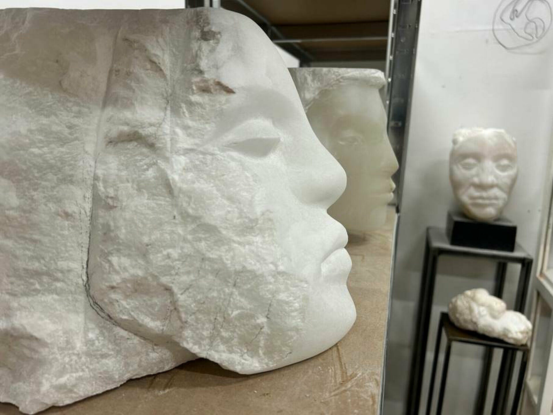 Stenen vi arbetar med den här kvällen är alabaster, en relativt mjuk och lättbearbetad sten. Den är känd för sin transparens och sina lerskiftande vener, vilket gör den särskilt lämpad för skulpturalt arbete.