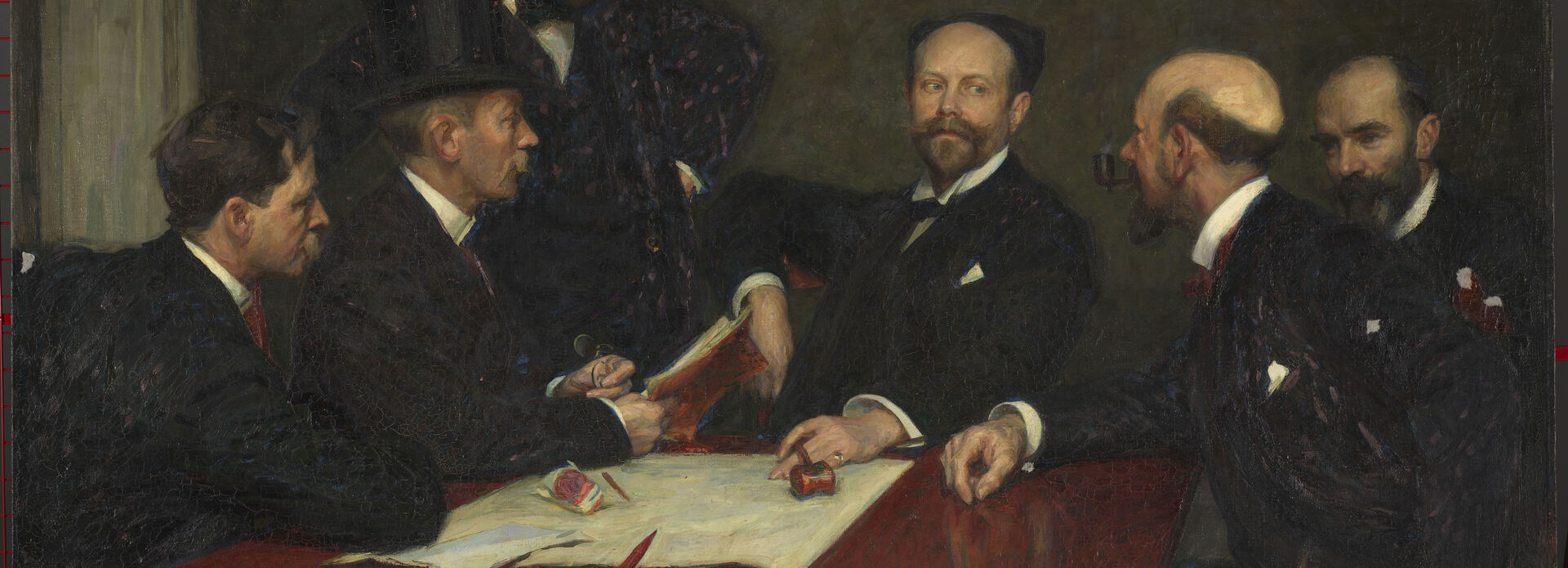Konstnärsförbundets styrelse är ett nyckelverk i svensk konsthistoria. Konstnärsförbundet var en rörelse som starkt påverkade den svenska konstscenen vid 1800-talets slut. Under 1870- och 80-talet växte sig missnöjet med etablissemanget och Konstakademien allt större bland unga konstnärer. De ansåg bland annat att akademiens ideal var föråldrade och att möjligheterna att ställa ut sin konst alldeles för små. Missnöjet utmynnade i en skrivelse 1885, det så kallade opponentuppropet. Rörelsen stöptes med tiden om till det som kom att kallas för Konstnärsförbundet och som blev ett reellt alternativ till den akademiska sfären. Richard Bergh var en av de tongivande medlemmarna och har här målat förbundets styrelse: sittande från vänster Christian Eriksson, Eugène Jansson, Nils Kreuger, Karl Nordström(ordf), Robert Thegerström, Rickard Bergh. Vid målningens tillblivelse, 1903, är Konstnärsförbundet själva etablissemanget i svenskt konstliv.