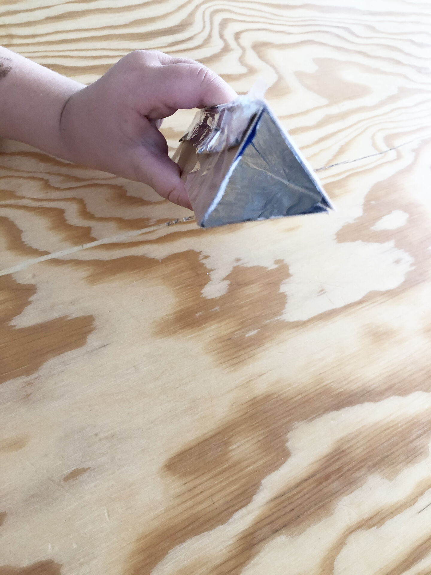 2. Ta fram aluminiumfolie och klipp ut en bit som är 18x14 cm. Limma på kartongbitarna med 2 mm mellanrum, vik till en triangelform och limma ihop med den överlappande pappersbiten.