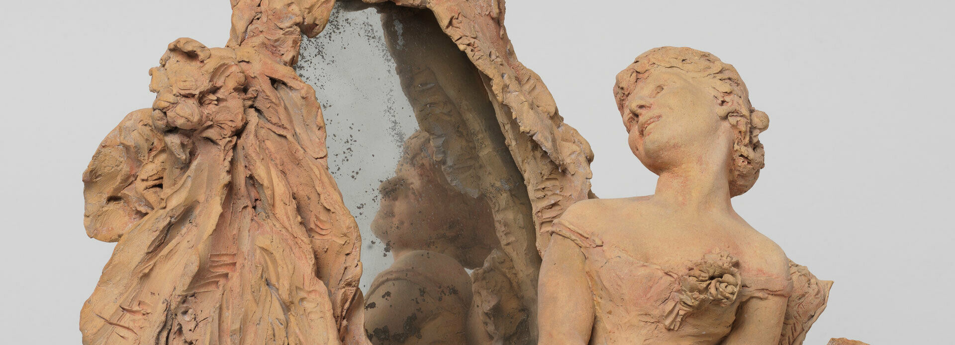 Ingel Fallstedt (1848–1899), Kvinna vid spegel, ca1880. Terrakotta med delvis spår av bemålning samt spegelglas. NMSk 2421.