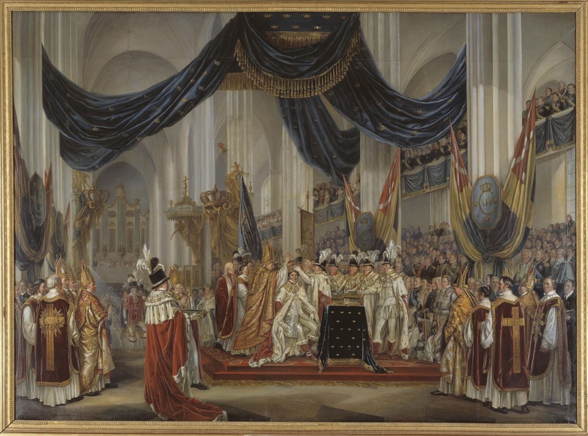 Per Krafft d.y.:s målning skildrar det ögonblick då kronan sätts på Karl XIV Johans huvud under kröningen i Storkyrkan. Det bernadotteska dynastins framtid representeras av hans son, kronprins Oskar (I), som står snett bakom fadern. Genom det från vänster infallande ljuset betonas kontinuiteten i historien; det faller på Sofia Albertina, syster till Gustav III och Karl XIII, som här representerar det tidigare kungahuset.