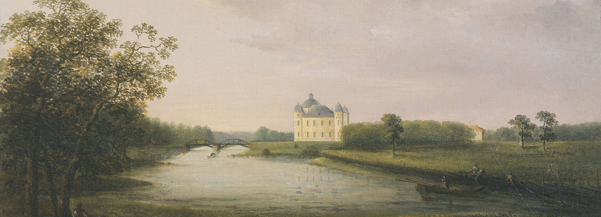 Strömsholm ligger på en ö i Kolbäcksån. Det nuvarande slottet ritades av Nicodemus Tessin d.ä. på 1660-talet och stod färdigt ett drygt decennium senare. I Pehr Gustaf von Heidekens målning ses byggnaden från ån, med några fiskare som en pittoresk detalj i förgrunden.
