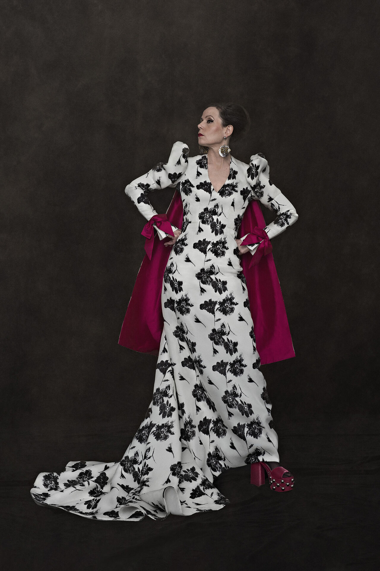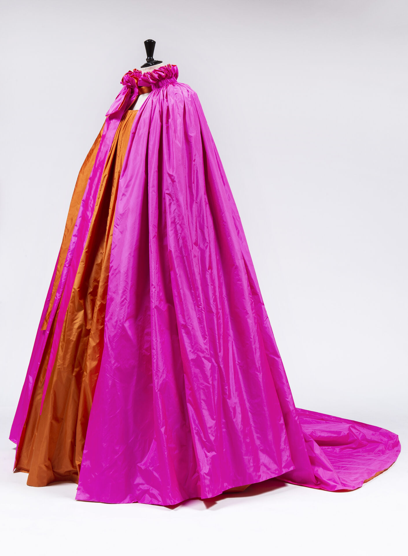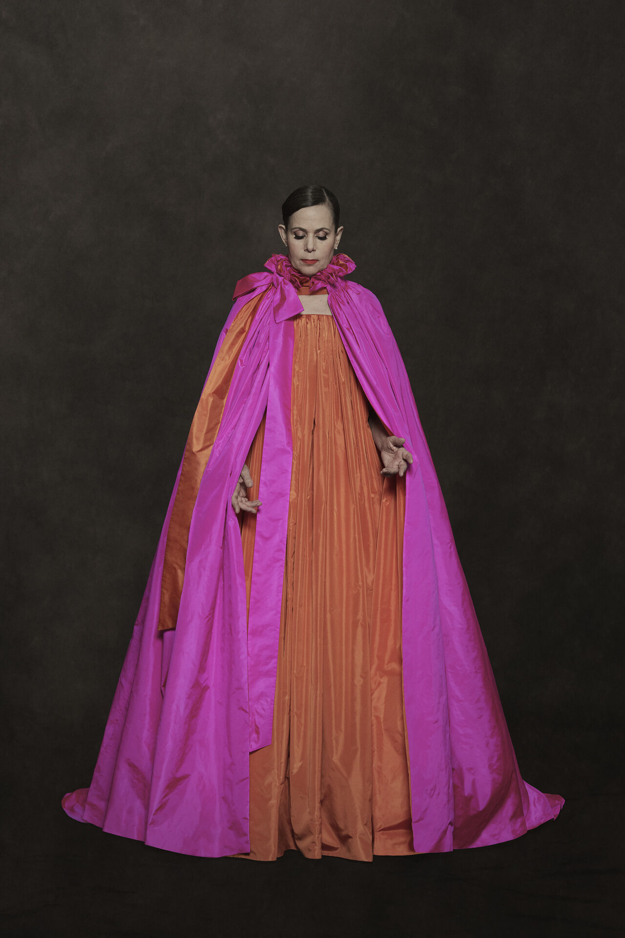 Sara Danius bär det mest modiga valet i kväll! En knallcerisce cape och en cognacsfärgad klänning. 25 meter av vacker sidentaft har skapat denna kreation – signerad Pär Engsheden.