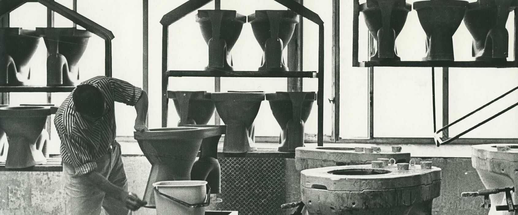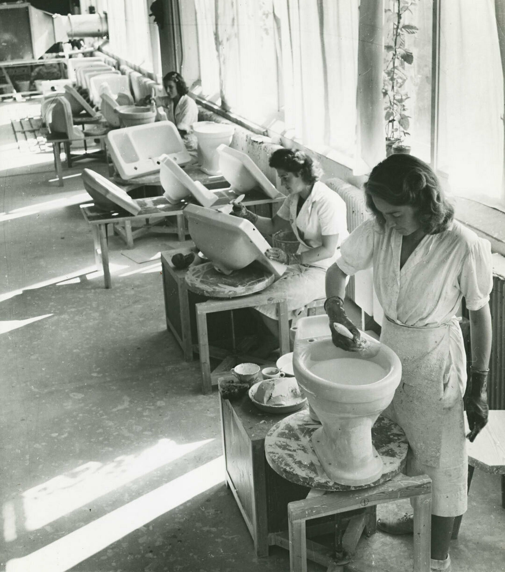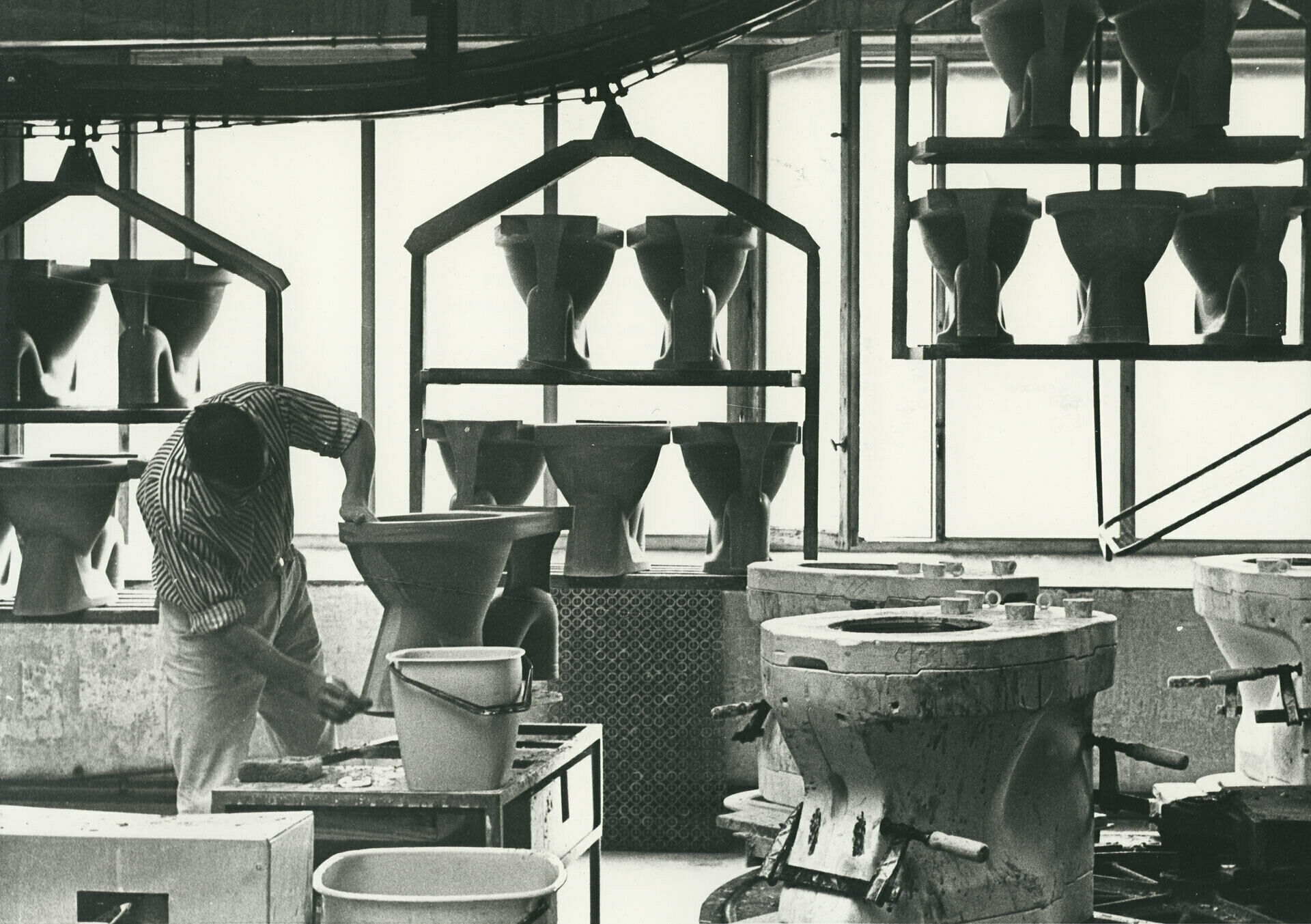 Porslin har tillverkats i Gustavsberg sedan 1825, efter engelskt manér. När Kooperativa Förbundet köpte Gustavsbergs porslinsfabrik 1937 inleddes en modernisering av fabriken. Utöver hushållsporslin och konstgods påbörjades produktion av sanitetsporslin. Tio år senare blir formpressade plåtbadkar resultatet av ett unikt samarbete med den amerikanska bilindustrin, och föremål i formgjuten plast tar också plats i produktion.